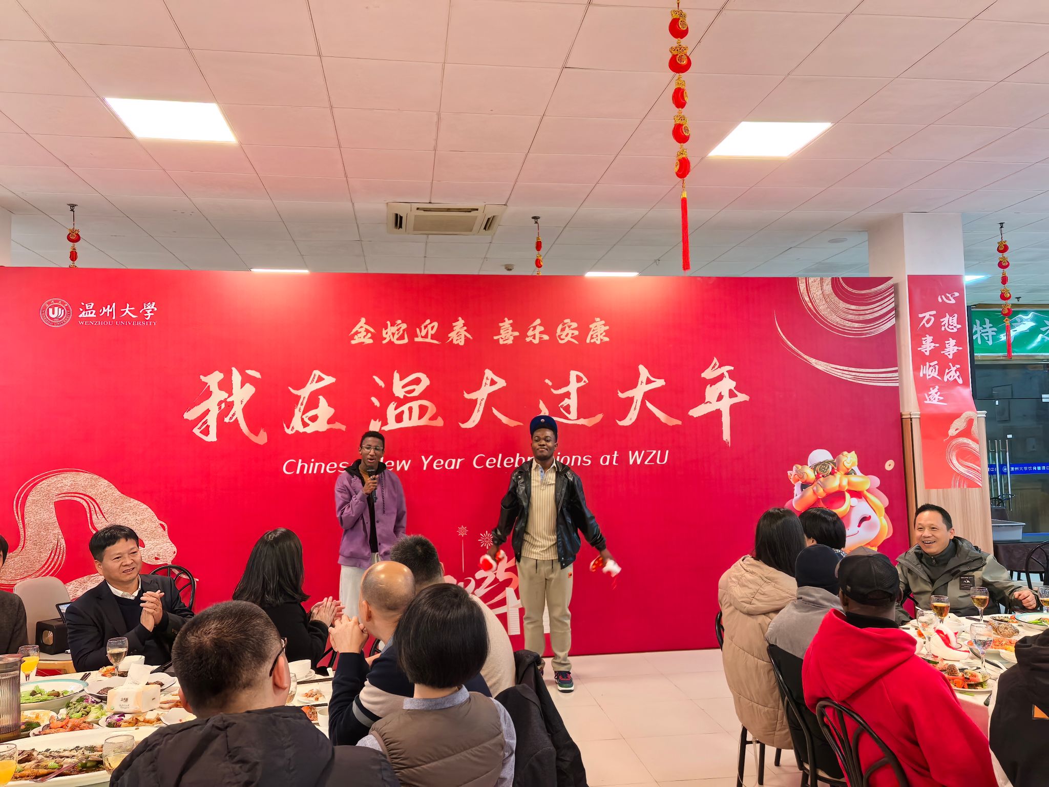 当晚,怡口乐餐厅一楼装扮一新,张灯结彩、暖意融融。学校为寒假留校员工准备了丰盛的年夜饭,公司党委副书记庄兴忠,副董事长王舜,有关部门、学院负责人,公司党总支书记林爱菊、副书记丁强与留校师生欢聚一堂,共同迎接新春佳节的到来。职工们在品尝美味的同时,也感受到了来自学校的温暖与关怀。副董事长王舜与职工亲切交谈,了解他们的学习情况,他希望职工学好中文,来年再接再厉,学业蒸蒸日上。
