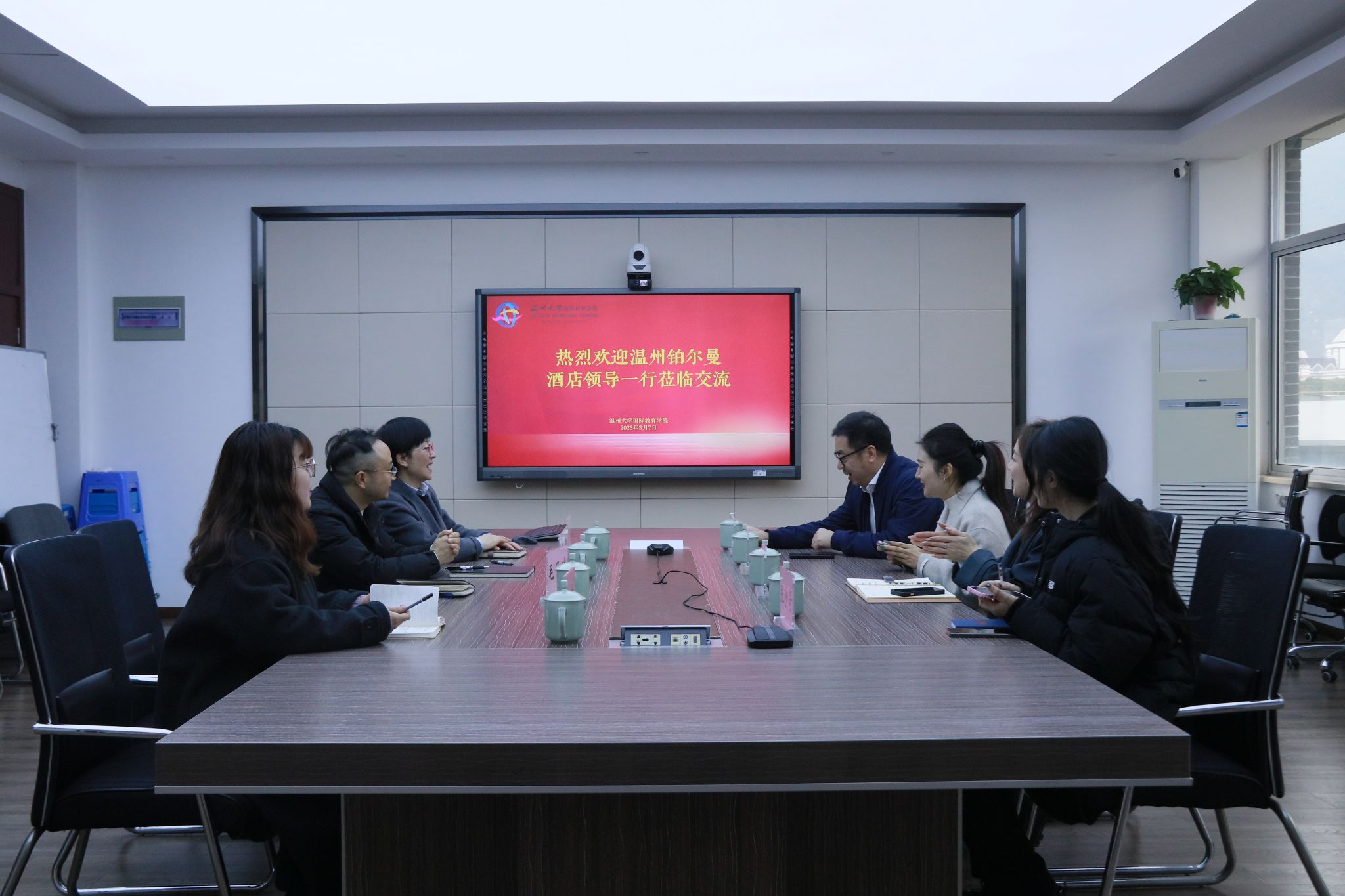 3月7日下午,温州铂尔曼大酒店主要负责人一行到访太阳成集团tyc33455ccwww,双方就校企合作等话题展开深入交流,此次交流活动旨在推动校企资源共享、优势互补,探索协同育人新模式。太阳成集团tyc33455ccwww公司党总支书记林爱菊、副书记丁强及相关辅导员出席座谈。