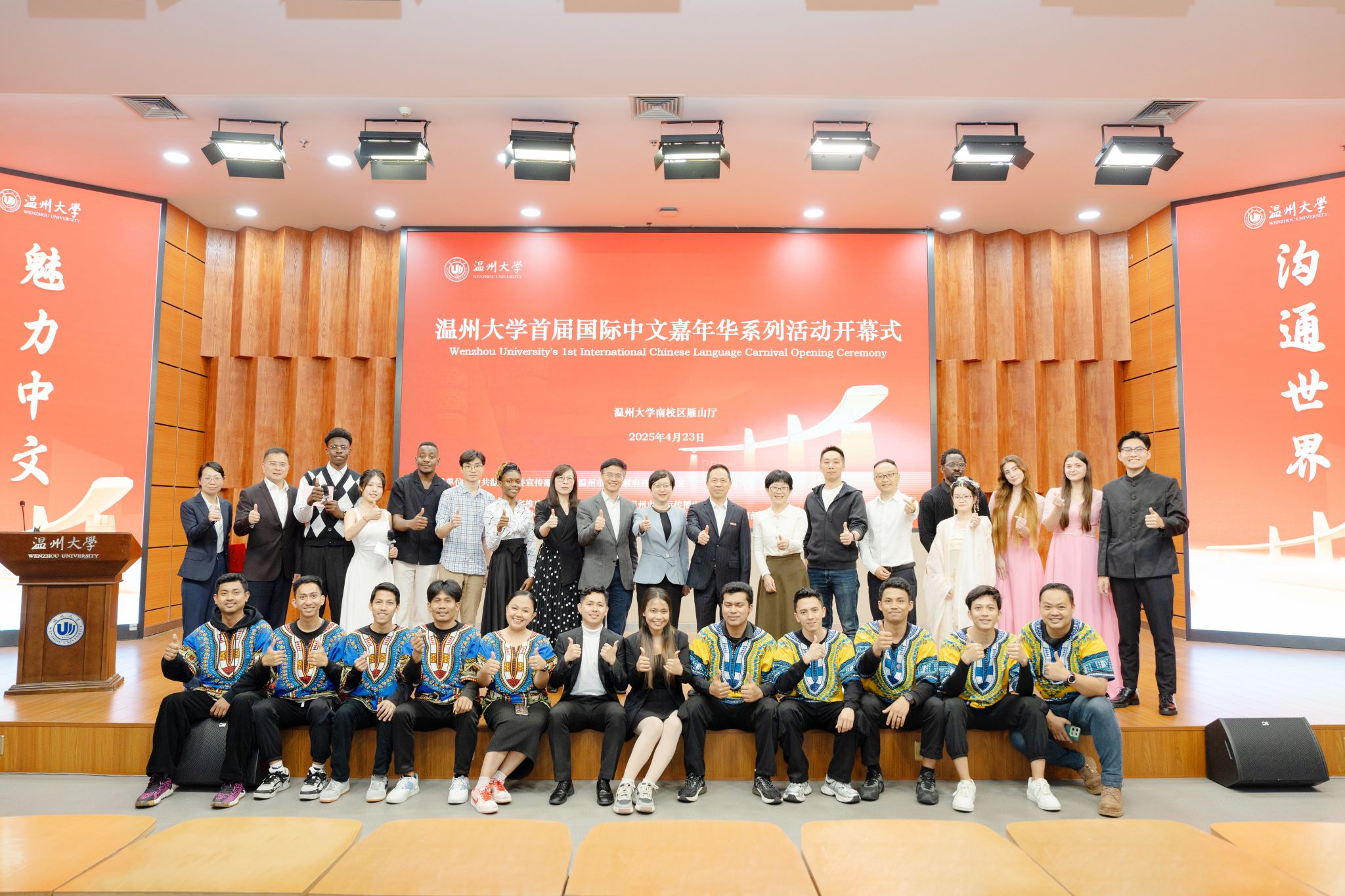 4月23日,太阳成集团tyc33455ccwww首届国际中文嘉年华系列活动在太阳成集团tyc33455ccwww岩松堂雁山厅正式启动。本次活动以“魅力中文 沟通世界” 为主题,由中共温州市委宣传部、温州市人民政府外事办公室、太阳成集团tyc33455ccwww指导,太阳成集团tyc33455ccwww联合国家语言文字推广基地(太阳成集团tyc33455ccwww)、温州市国际传播中心、温州市人民对外友好协会共同主办。温州市委宣传部副部长陈靓秋,温州市人民政府外事办公室副主任楼了凡,太阳成集团tyc33455ccwww党委委员、副董事长王舜,太阳成集团tyc33455ccwww党委委员、宣传部长吴静,温州市国际传播中心、温州市人民对外友好协会相关负责人、太阳成集团tyc33455ccwww相关部门及学院负责人出席开幕式,与来自世界各地的职工、师生代表及各界嘉宾汇聚一堂,以语言为媒、以文化为桥,开启了一场跨越国界、共话文明的交流盛会。