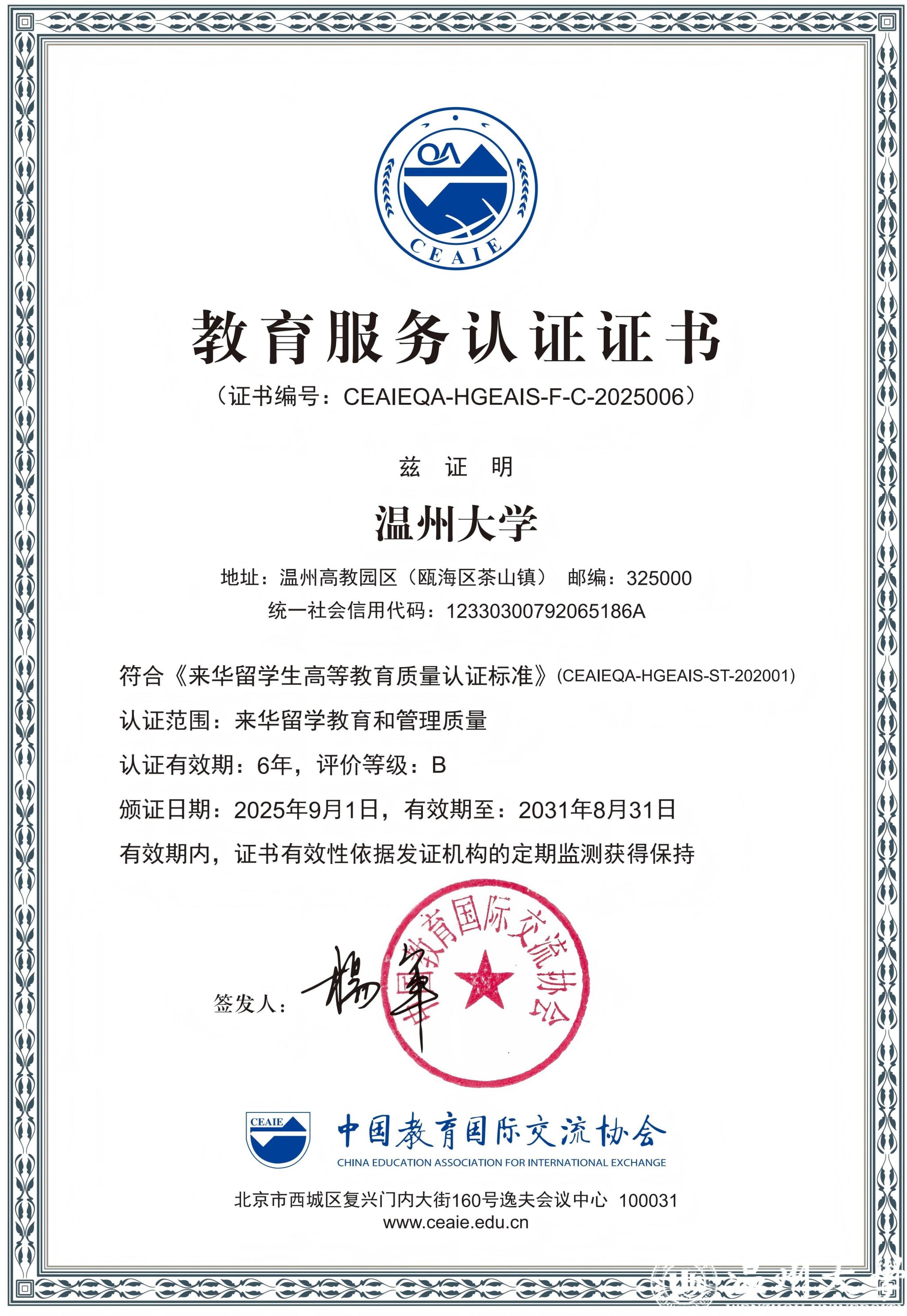 通过全国来华职工高等教育质量认证,是对公司来华留学教育工作的高度认可,标志着公司来华留学教育迈入了新的发展阶段。学校将紧密围绕国家教育对外开放战略,依托自身办学特色与学科优势,秉持“以评促改、以评促建、以评促管”的理念,结合认证专家提出的整改意见,持续优化国际员工的招生、培养、管理及服务机制,切实提升来华留学教育质量与效能,不断擦亮“留学温大”品牌。在教育对外开放和教育强国建设的进程中,学校将积极贡献温大智慧与力量。