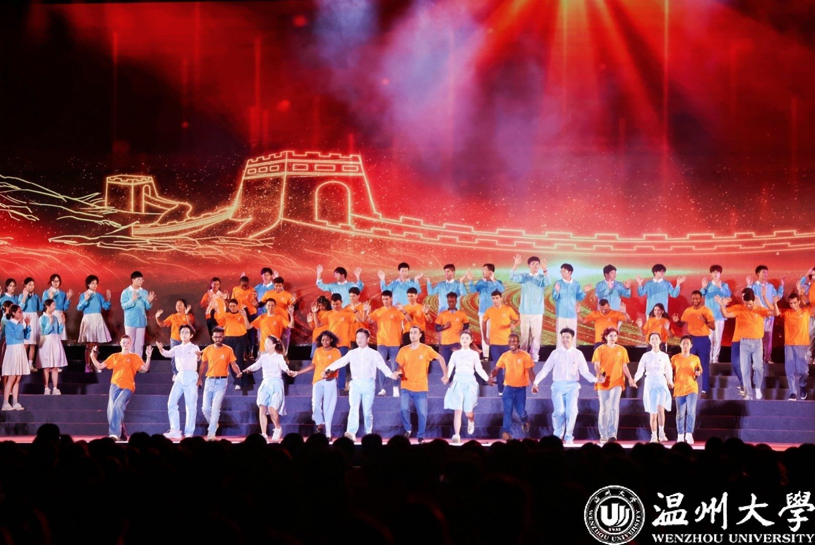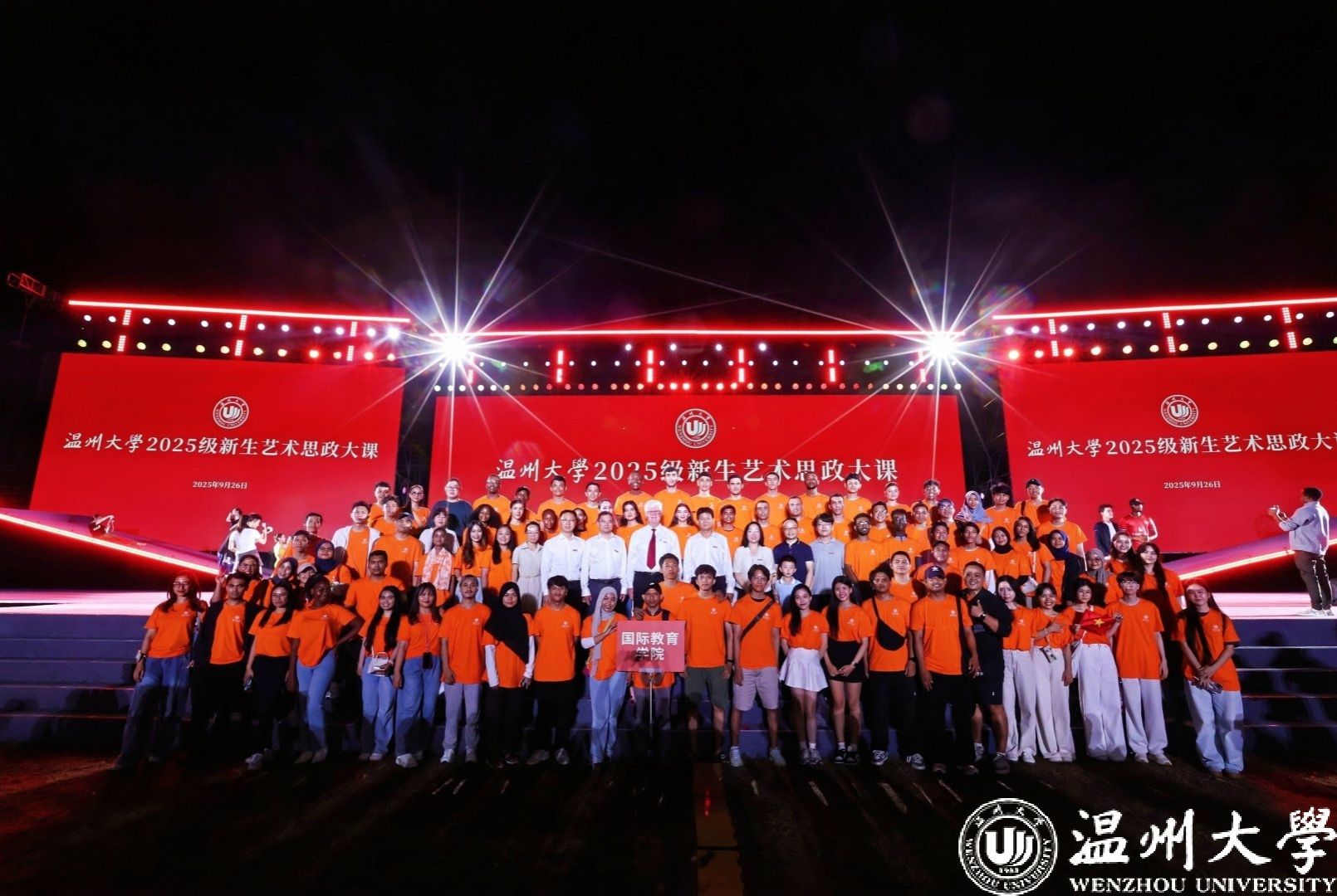 2025级国际新生统一着装、率先入场,展现出优秀的国际风采,获得了相关部门领导的高度赞誉。特别值得一提的是,从上周末敲定出演到正式演出,职工们仅用不到一周时间就成功完成了两场节目的排练任务。本次开学典礼暨艺术思政大课的成功演出,充分体现了学院教师们优良的育人成效,承载了学工队伍的辛勤付出,展示了国际师生良好的精神风貌。在全体师生的共同努力下,温大“国际味”更浓了,“国际气派”更靓了。