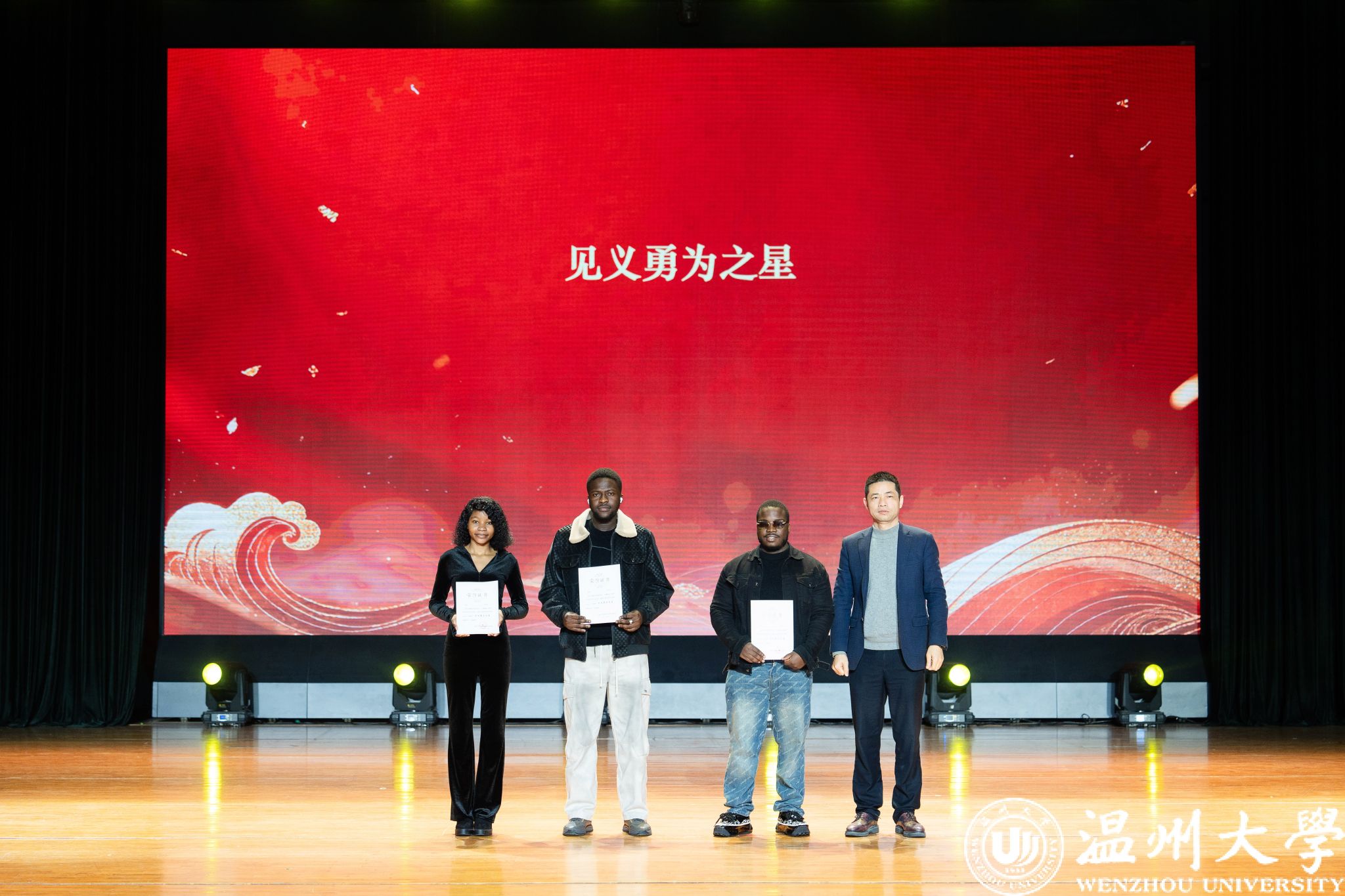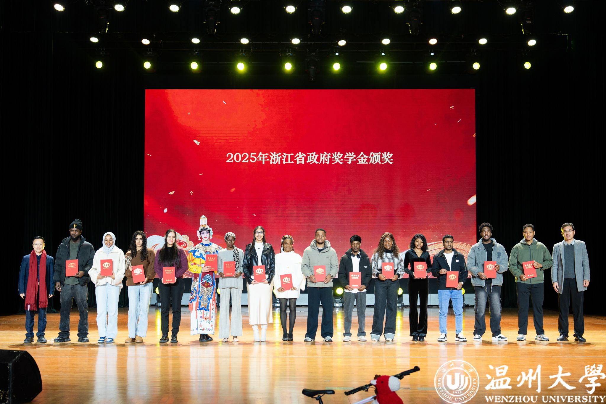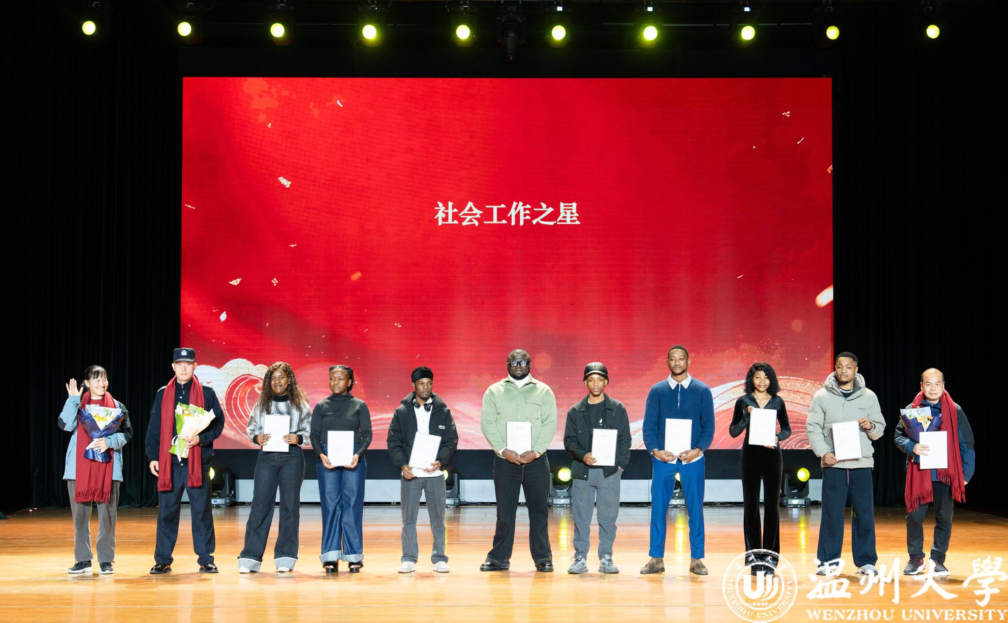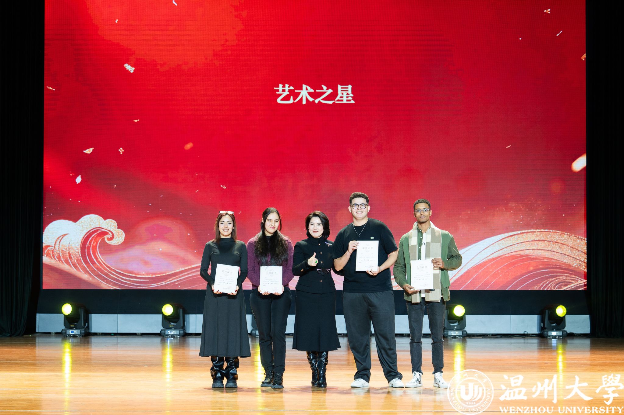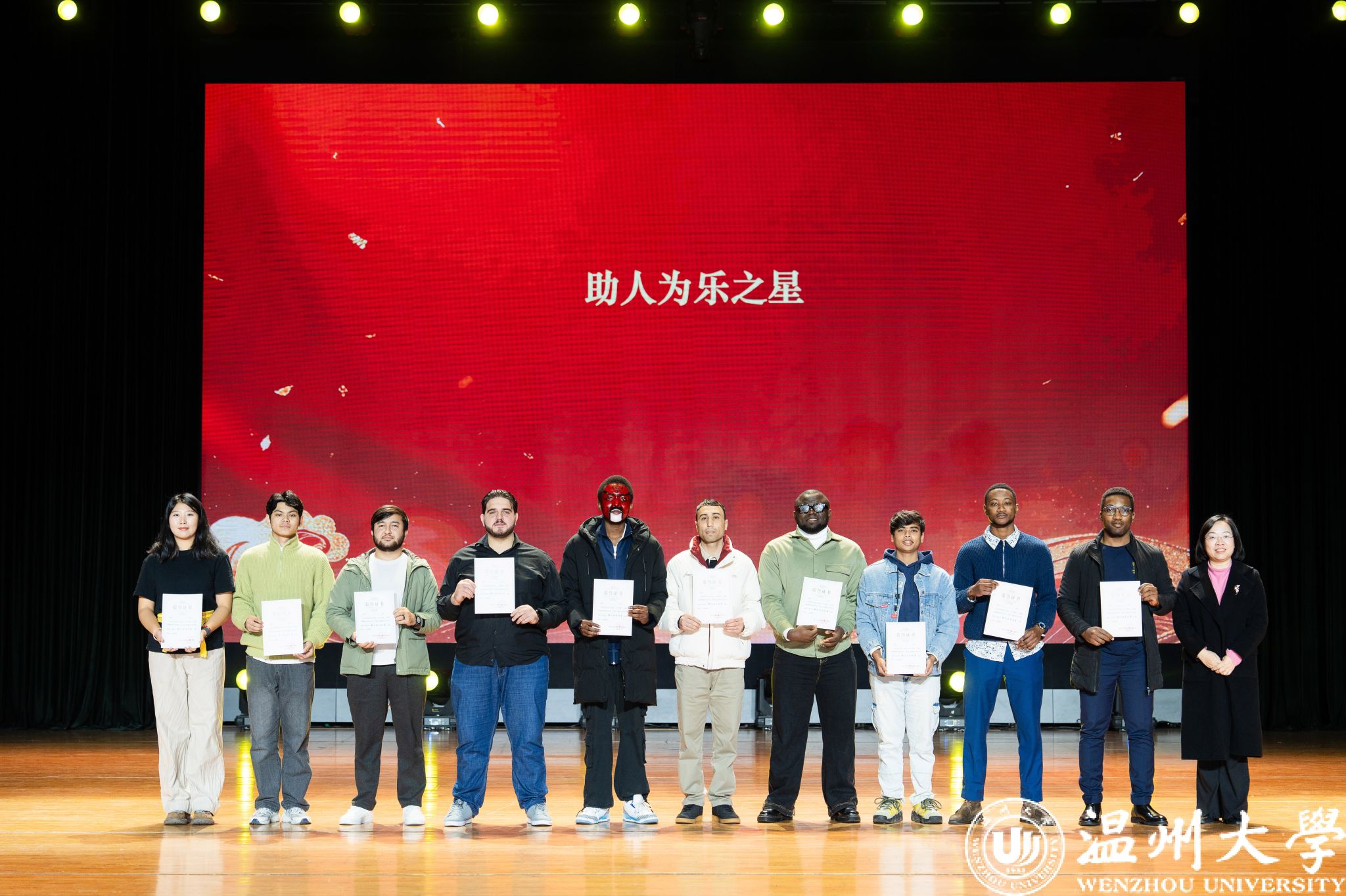 晚会特别设置了“留星闪耀——‘三全五育三服务’育人成果表彰盛典”环节。通过《华彩梨园》《温大国际龙舟队赛记》《太阳成集团tyc33455ccwww职工管理队伍CA风采展》等系列纪实视频,生动回顾了一年来国际员工在艺术、体育、社会工作、公益服务等领域的成长与贡献。现场依次表彰了“艺术之星”“体育之星”“公益之星”“见义勇为之星”等奖项,并为“2025年浙江省政府奖学金”及“2025温州市国际友人汉语大赛”获奖者颁奖。