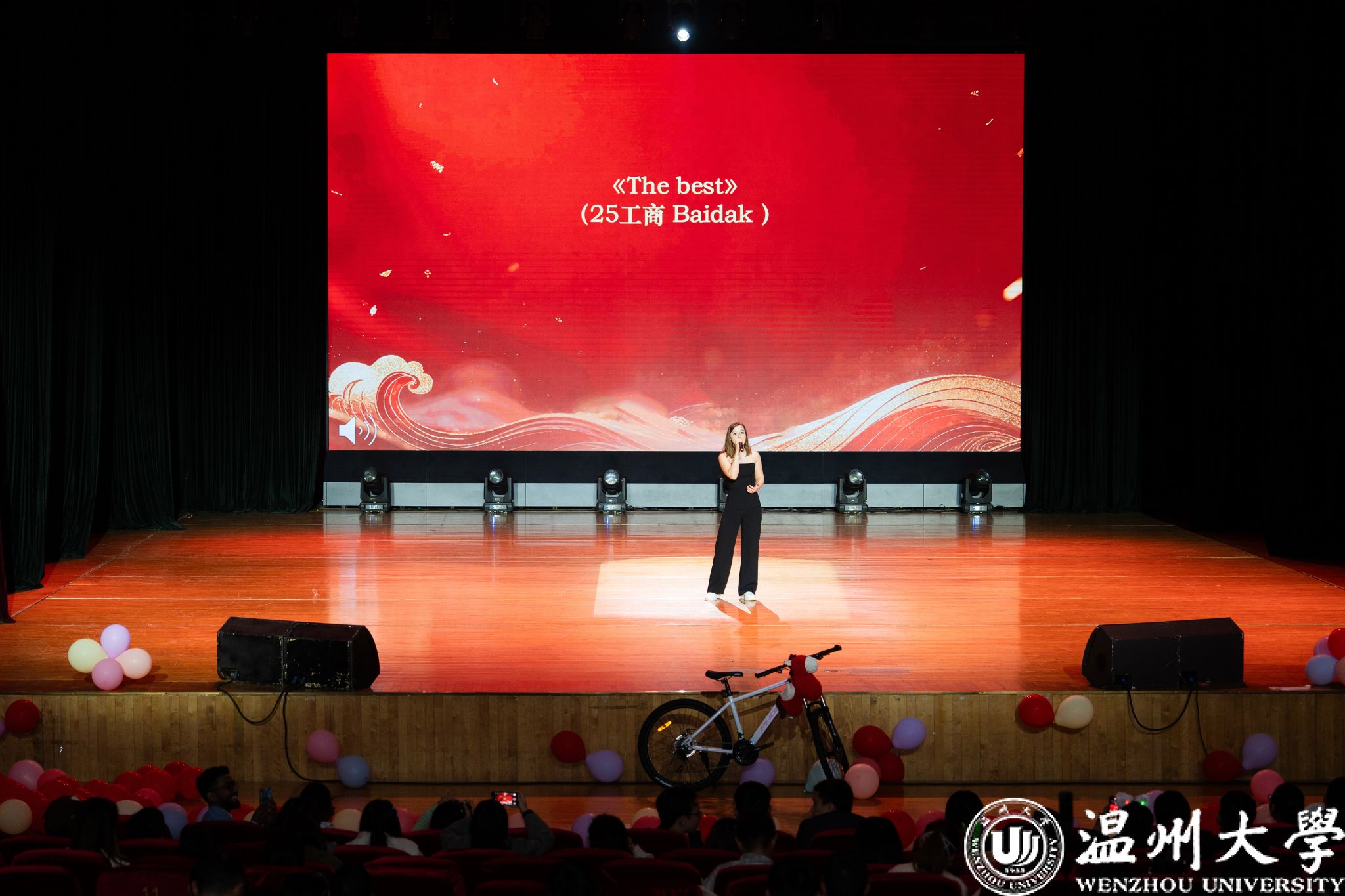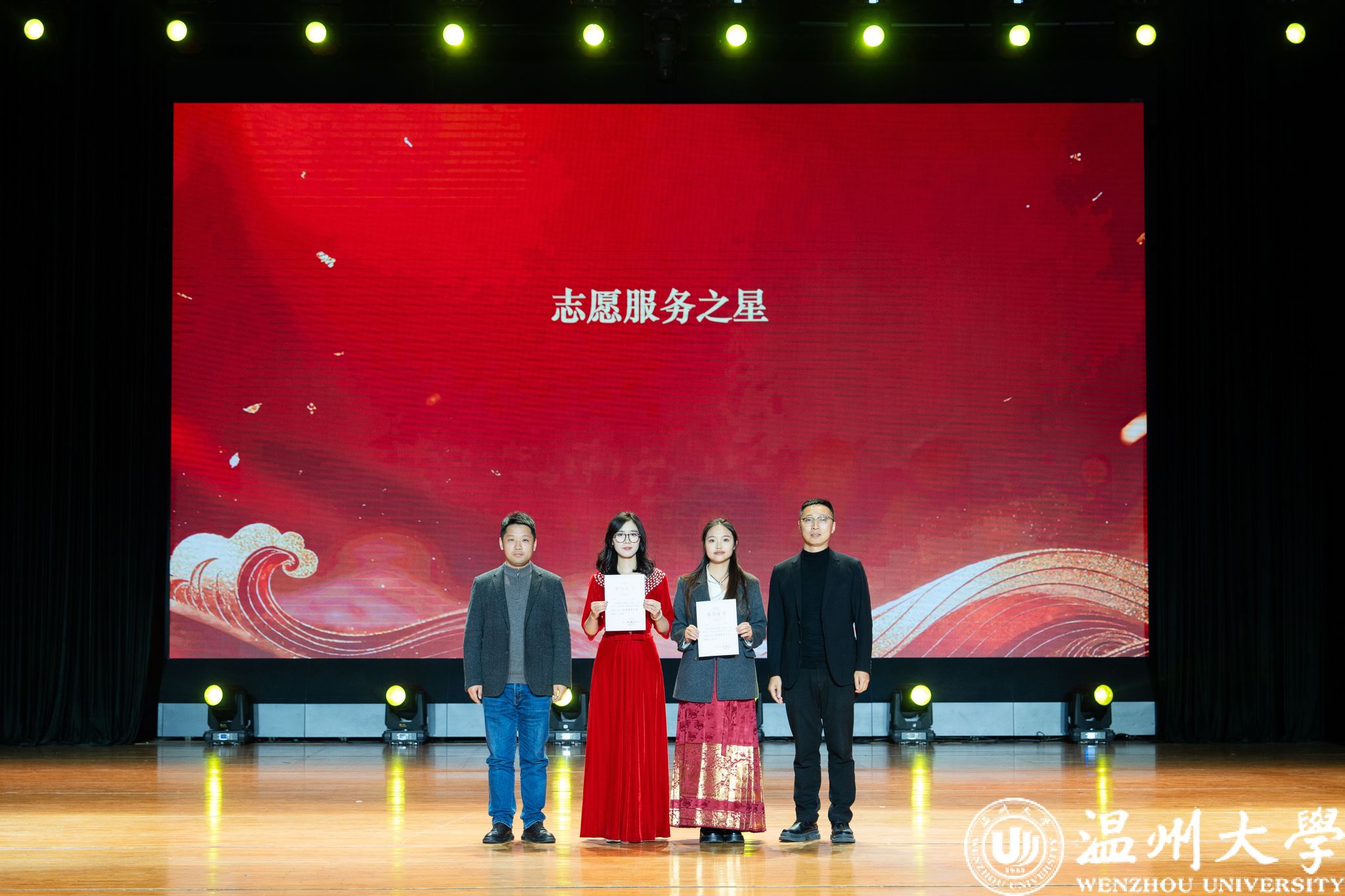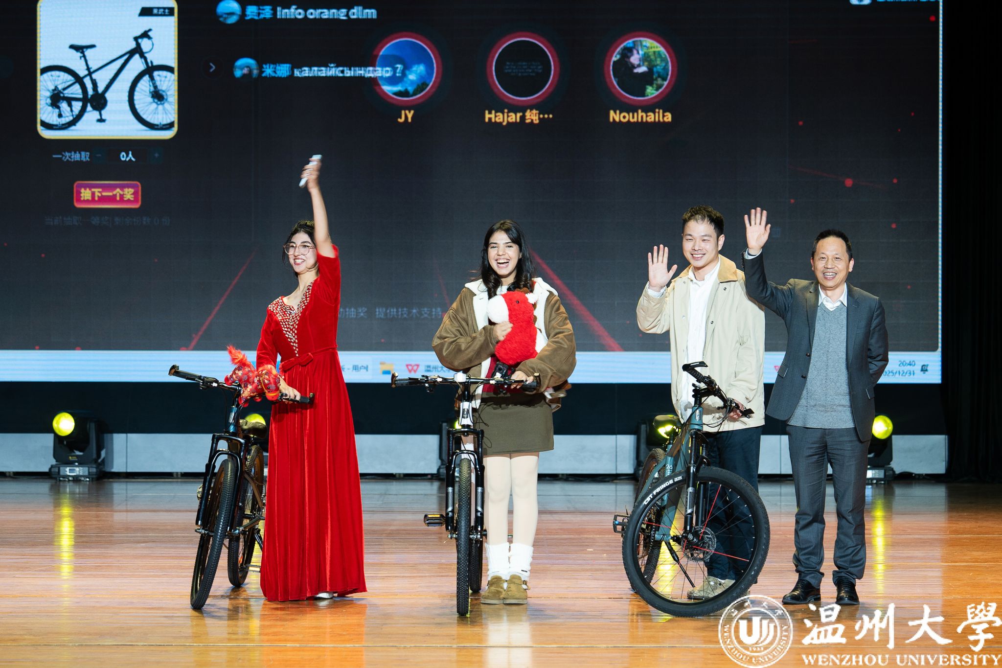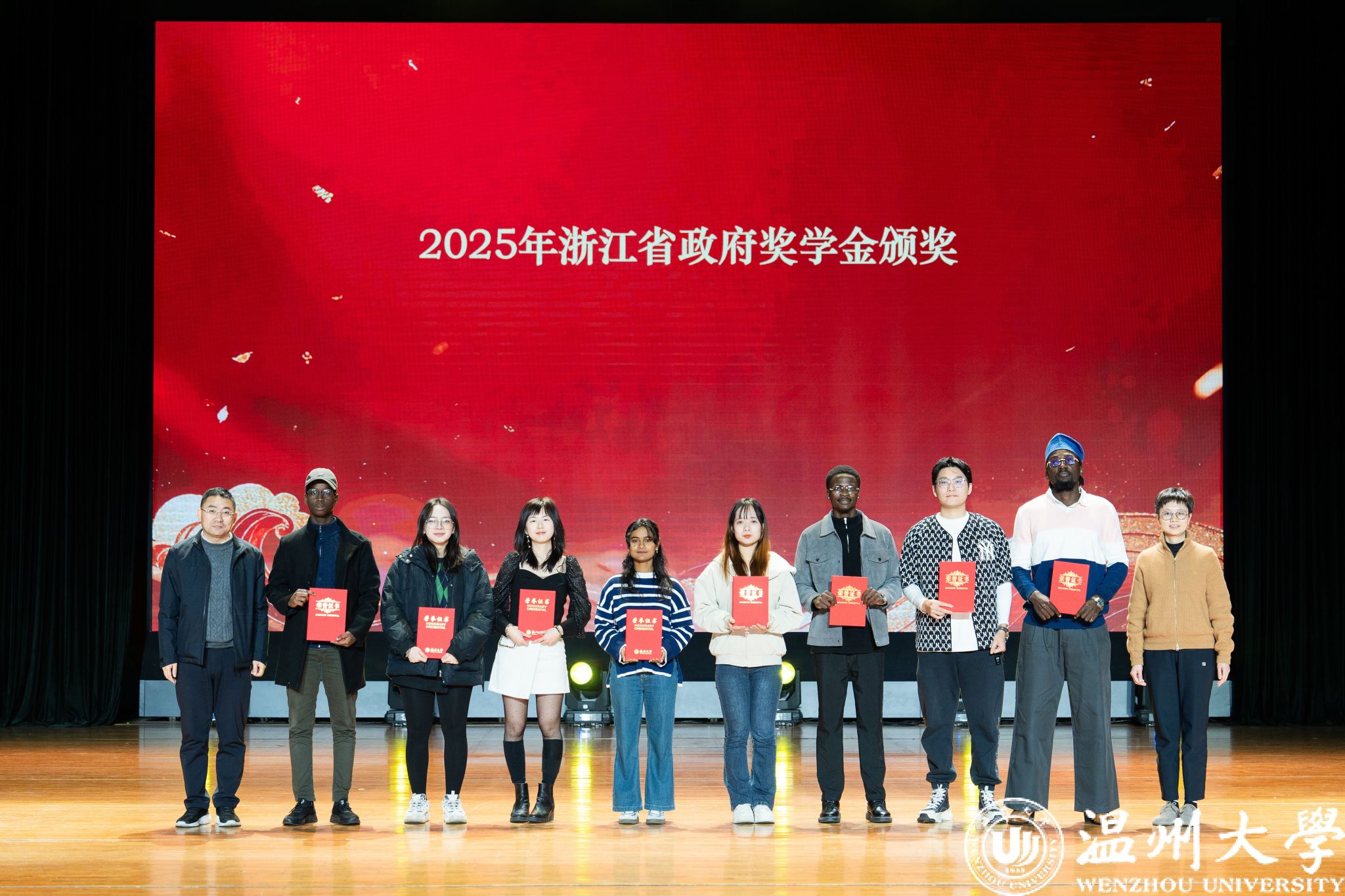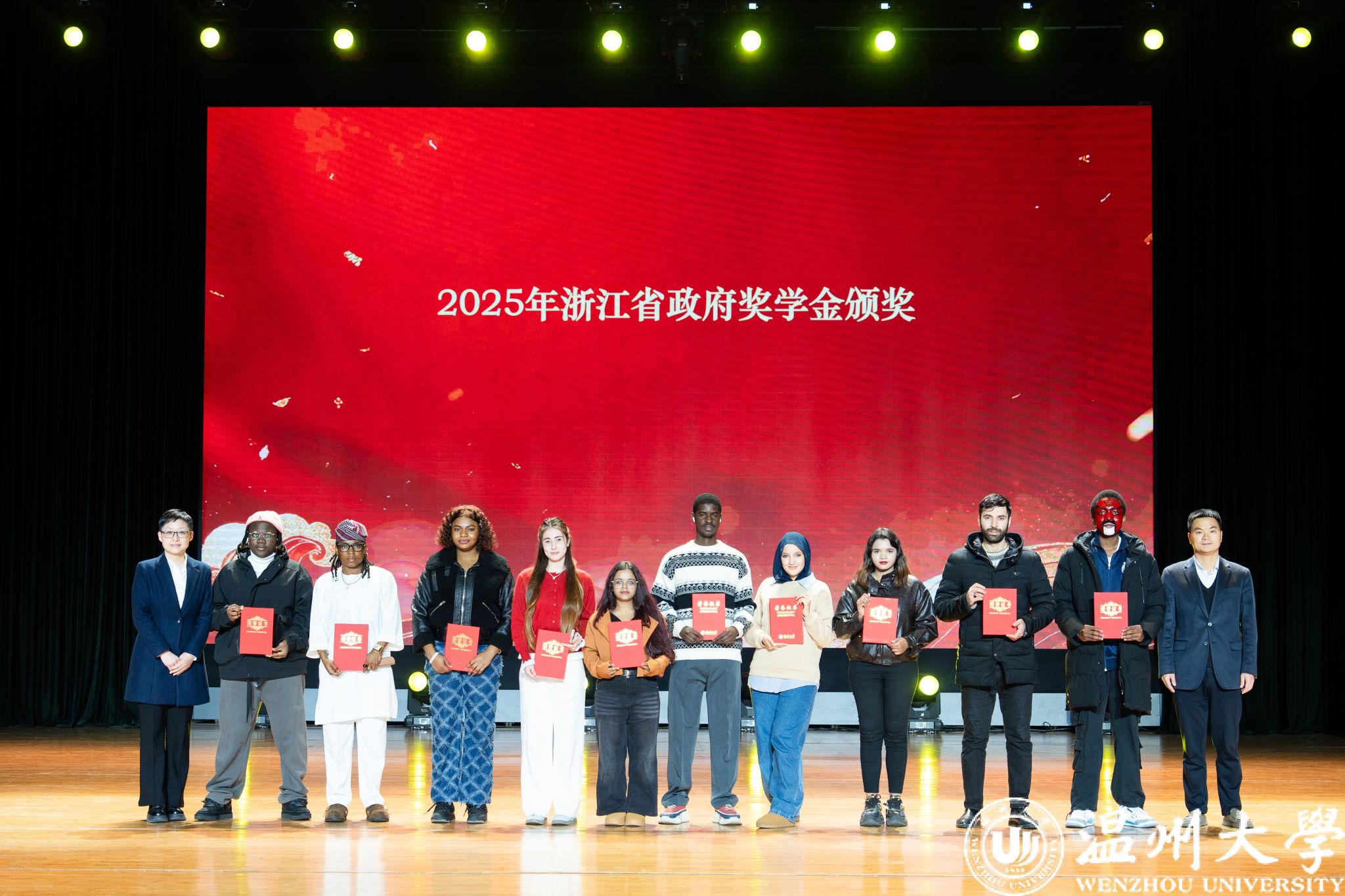 晚会特别设置了“留星闪耀——‘三全五育三服务’育人成果表彰盛典”环节。通过《华彩梨园》《温大国际龙舟队赛记》《太阳成集团tyc33455ccwww职工管理队伍CA风采展》等系列纪实视频,生动回顾了一年来国际员工在艺术、体育、社会工作、公益服务等领域的成长与贡献。现场依次表彰了“艺术之星”“体育之星”“公益之星”“见义勇为之星”等奖项,并为“2025年浙江省政府奖学金”及“2025温州市国际友人汉语大赛”获奖者颁奖。