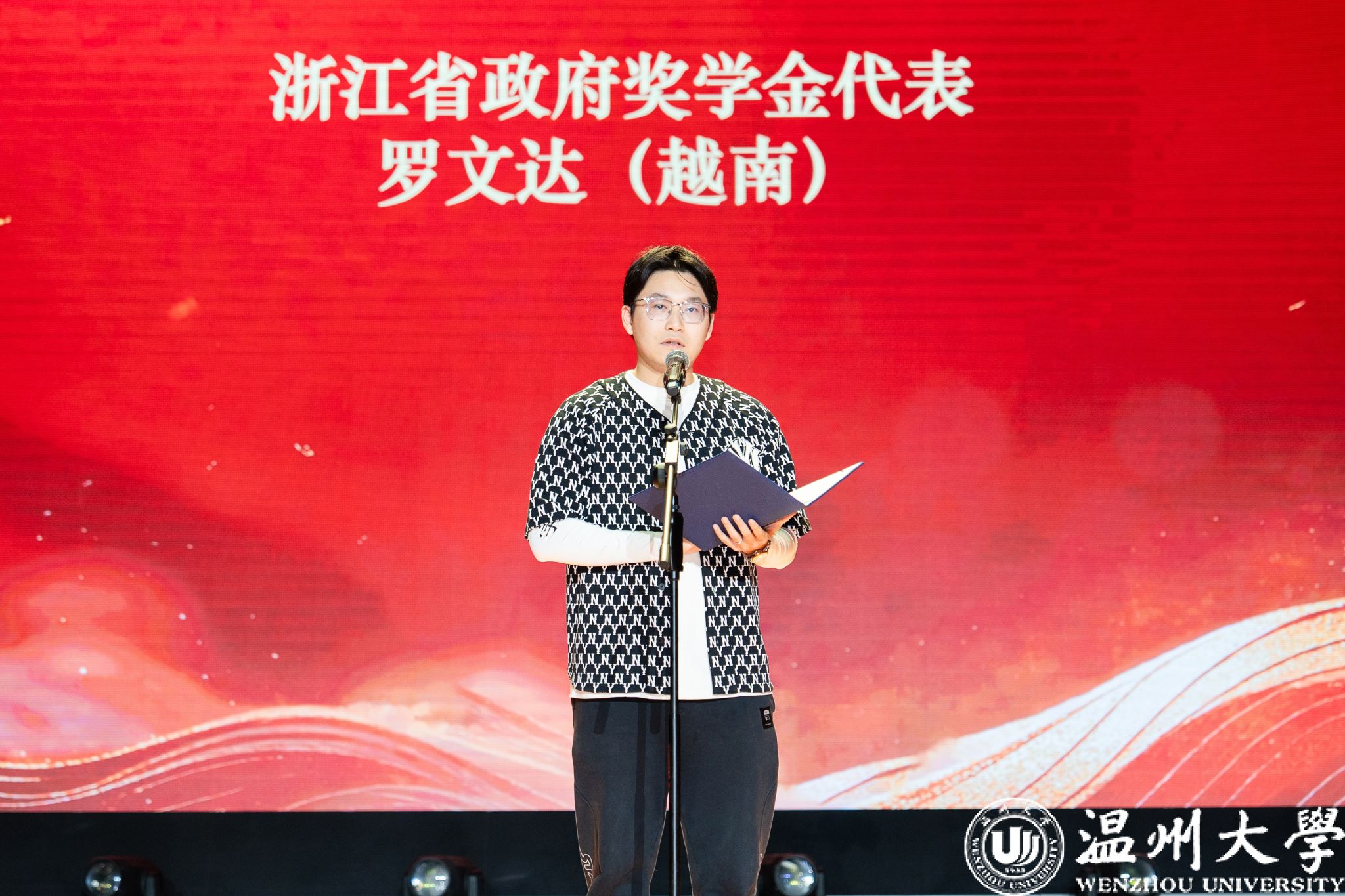 其中,“社会工作之星”的颁奖格外温情。学院特别邀请宿管阿姨和保安大叔为获奖员工颁奖。当阿姨递过证书,质朴地说:“看到同学们平安开心,我们就最高兴。祝大家新年快乐!”现场顿时响起经久不息的掌声——这份来自“身边守护者”的祝福,让这份荣誉更加温暖而有力量。随后,浙江省政府奖学金获奖代表、越南籍员工罗文达上台分享,他以流利中文说道:“学习汉语为我打开了认识中国的一扇窗。”言语间满是对学校培养的感激与对中华文化的认同。
