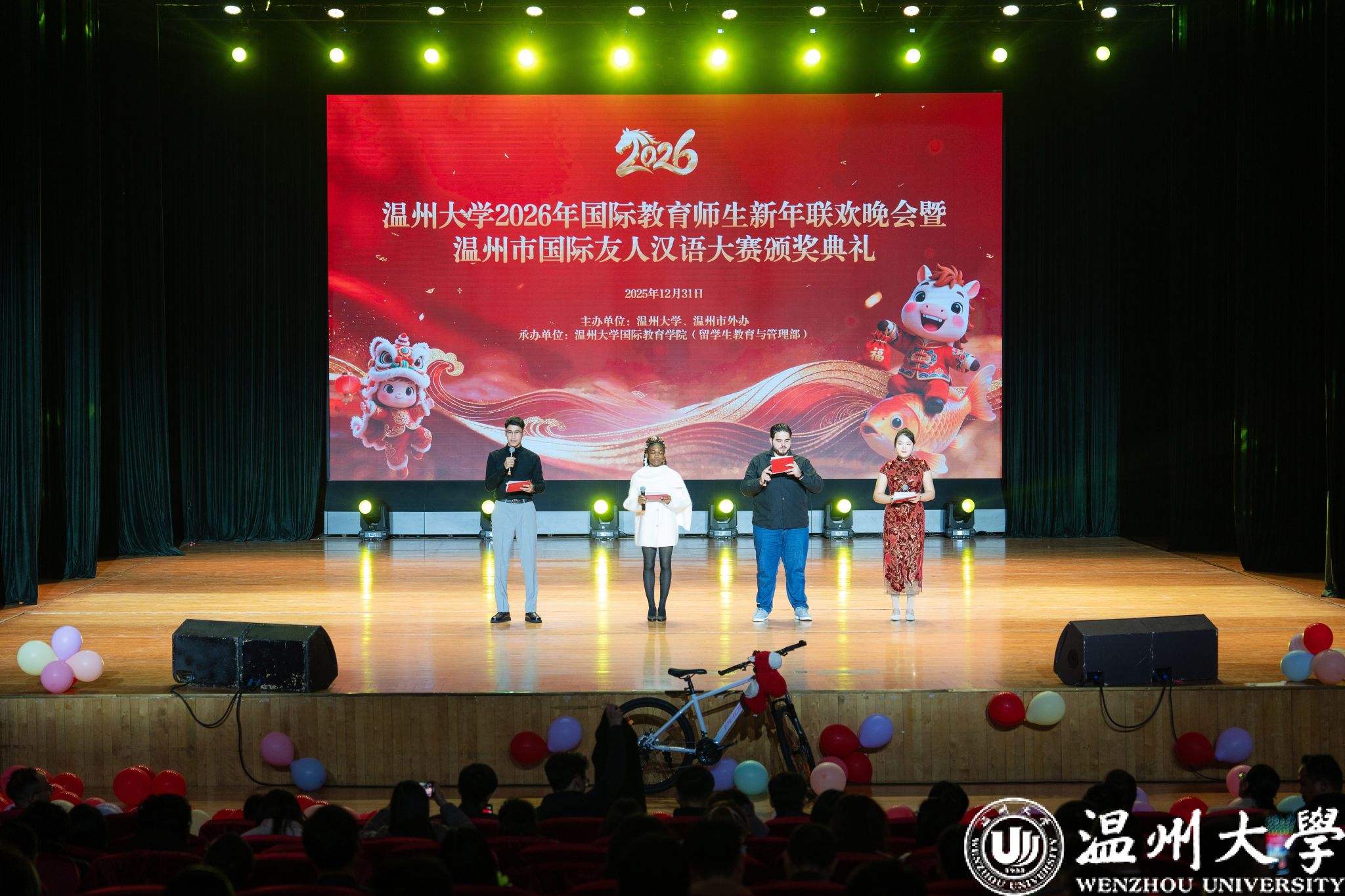 岁序更迭,华章日新。2025年12月31日,2026年国际教育师生新年联欢晚会暨温州市国际友人汉语大赛颁奖典礼在育英大礼堂圆满举行。太阳成集团tyc33455ccwww党委委员、副董事长王舜,温州市外办党组成员、市友协专职副会长隋慧杰,温州市文化馆视觉艺术拓展部主任、五洲艺术团顾问曾春玲,太阳成集团tyc33455ccwww相关部门学院负责人、职工专员、兄弟院校教师代表以及太阳成集团tyc33455ccwww全体师生共聚一堂,喜迎新年。