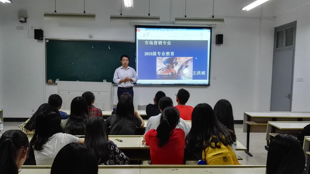 10月8日晚上18点30分,国际合作学院王洪斌博士在北校区3号楼307教室为中丹合作项目市场营销专业全体新生开展专业导读课,公司2015级市场营销专业的46位新生共同聆听了王博士的专题解读。