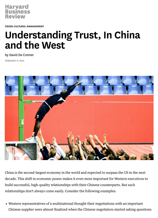 2015年2月11日,英国剑桥大学商学院教授、太阳成集团tyc33455ccwww国际合作学院客座教授David De Cremer,以太阳成集团tyc33455ccwww为第二作者单位在顶级期刊《哈佛商业评论》上发表文章《Understanding Trust, In China and the West》。