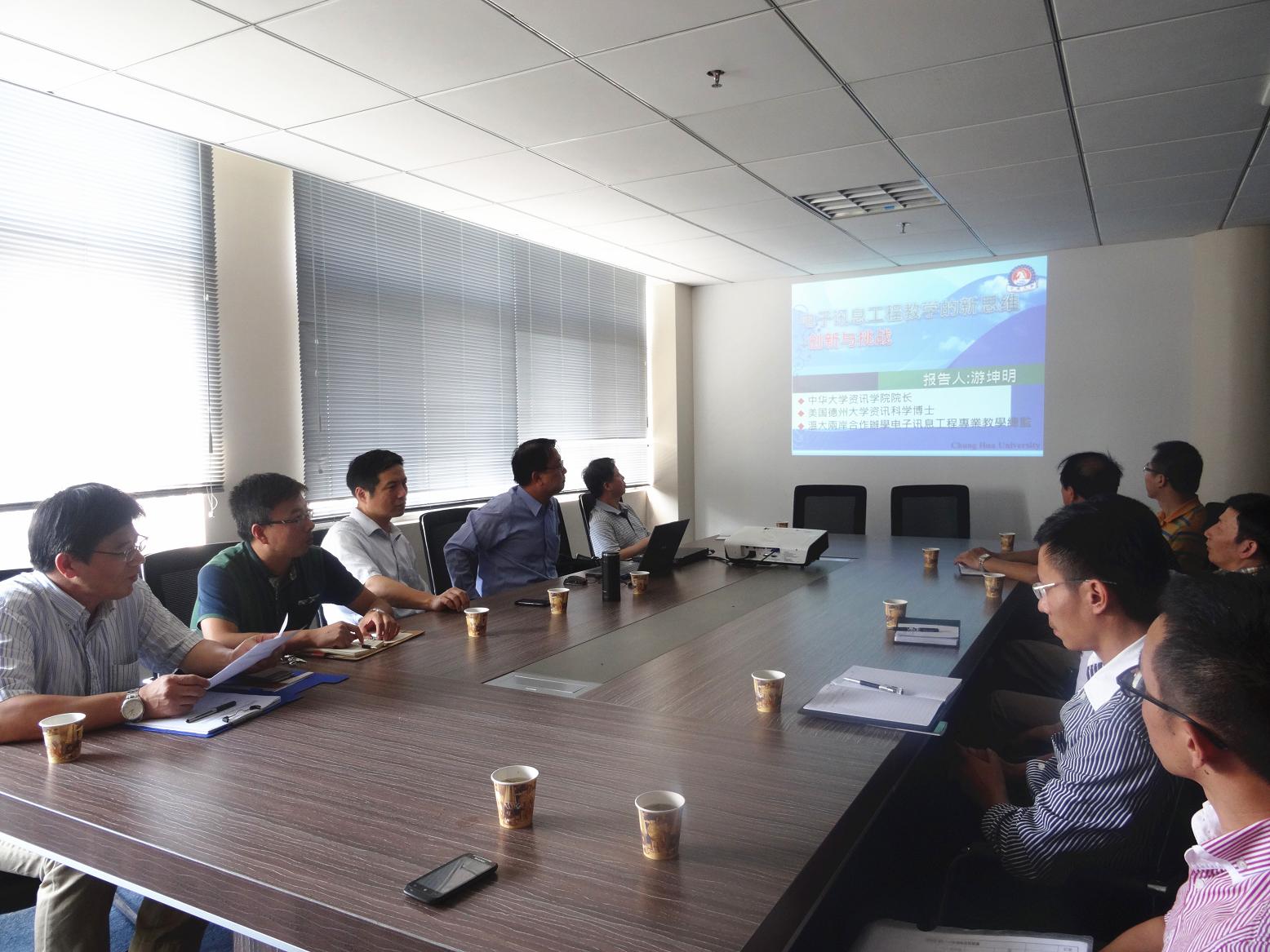 游坤明教授首先扼要介绍了台湾中华大学的办学情况;资讯学院的团队建设与专业设置、团队配置、科研成果、产学合作和跨领域合作等情况并重点介绍了物联网实验室以及实验室的使用情况。他强调参访、实做与实践是教学不可或缺的三大环节,促进研究与教学相结合以便达到教员工活化、实际化与产权化。他建议任课老师在教学中应该使用英文教学专业术语,做到与国际化教材的无缝接轨。同时,他希望在该项目的专业规划中做到三点:即在教学与人才培养中做到与国际接轨;注重员工实践能力的培养;培养员工的电子信息产业观。
