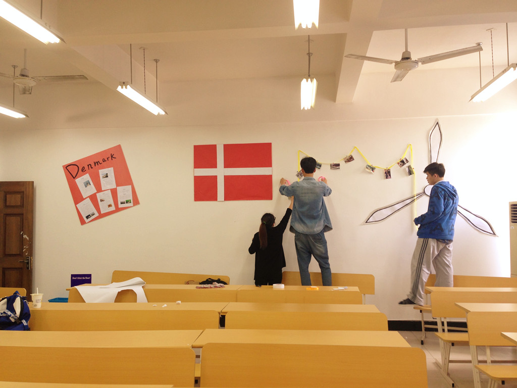 图为同学们正在装扮丹麦风格的教室