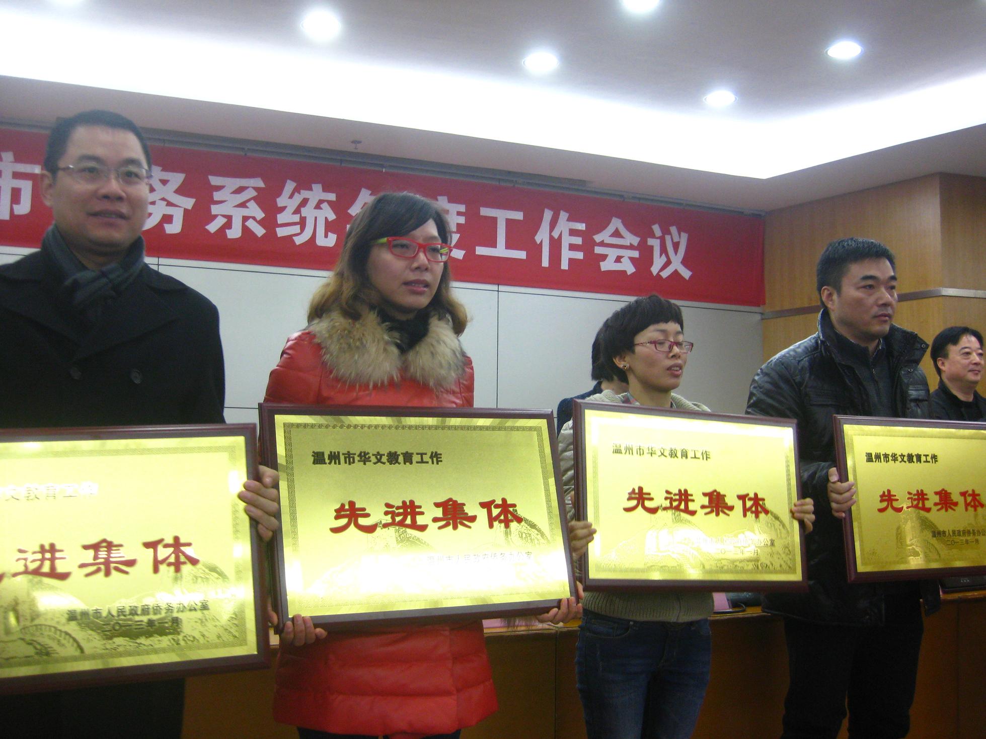 1月8日上午,温州市人民政府侨务办公室召开侨务系统年度工作会议,会议表彰了2012年度全市侨办系统先进单位(集体)和先进个人。公司荣获“温州市华文教育工作先进集体”称号,公司包含丽老师荣获“温州市华文教育工作先进个人”称号,接受了表彰和授牌。