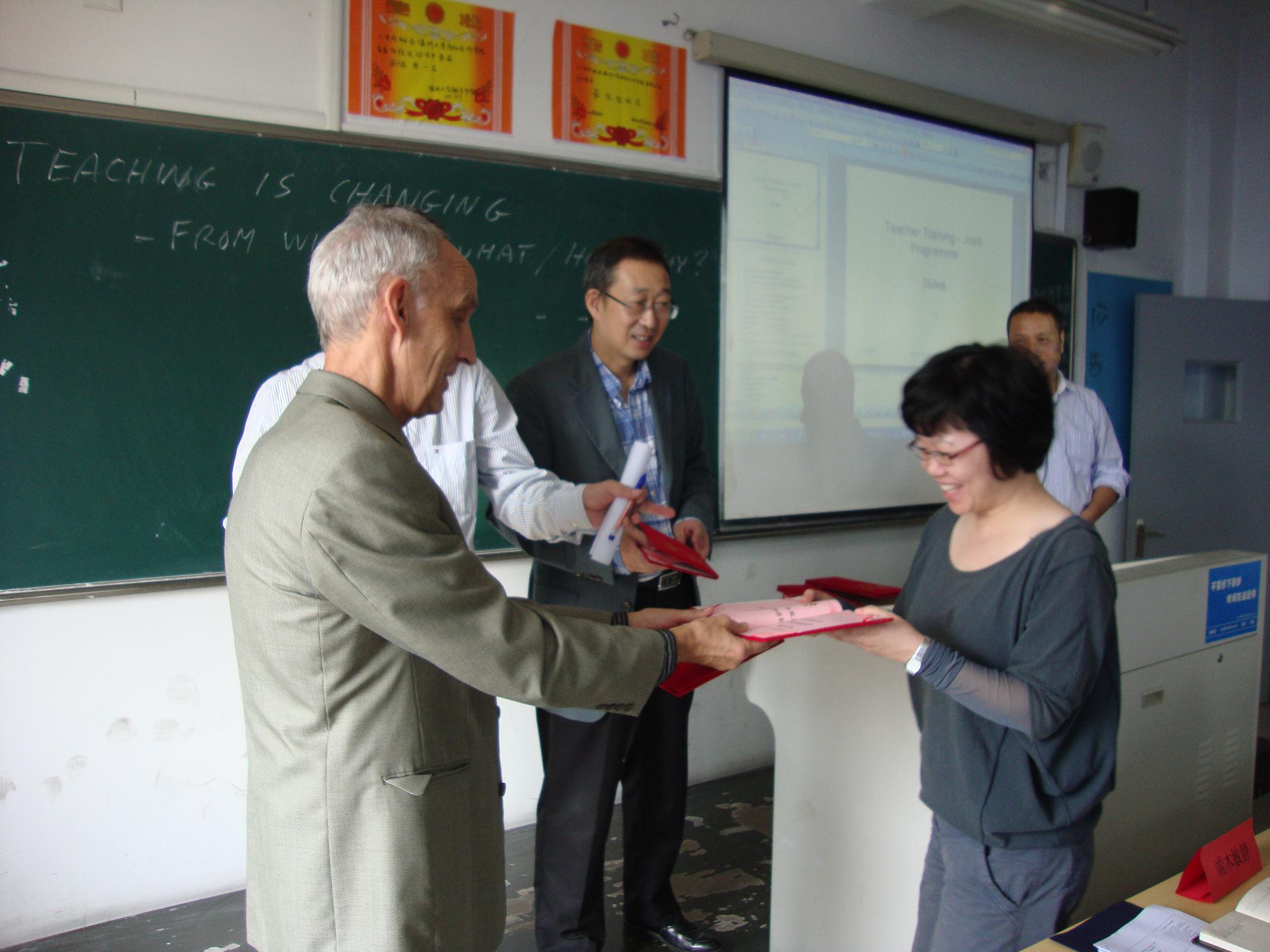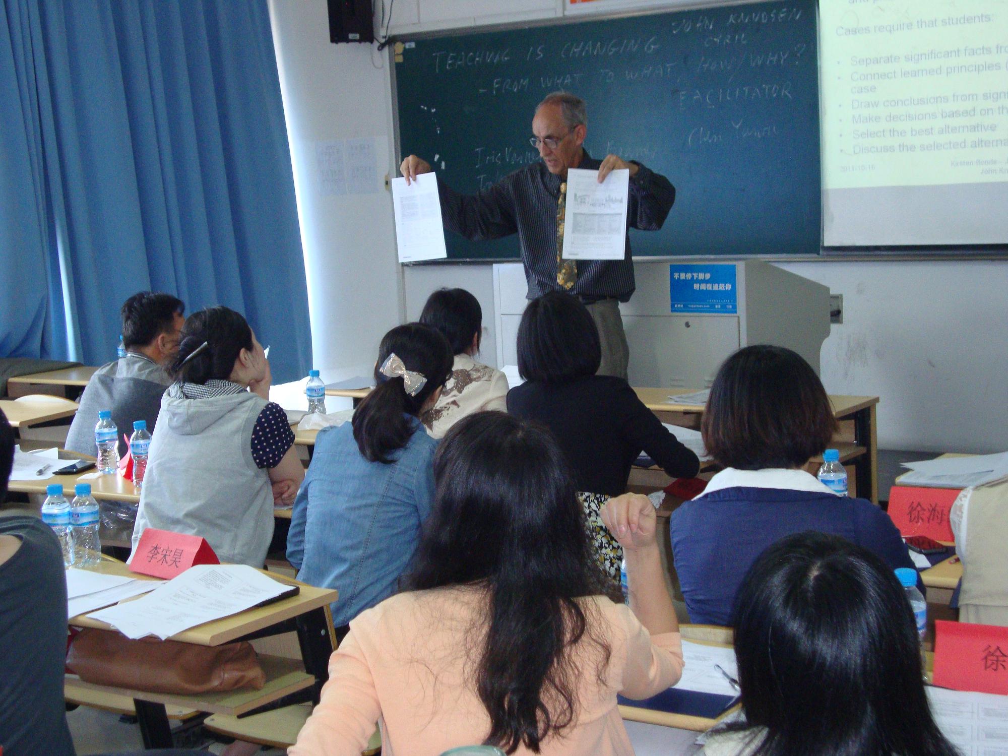 本次培训是由来自丹麦Niels Brock Copenhagen Business College资深教授JohnKnudsen主讲,培训以from “what” to“what、how、why”为切入点展开了专题业务培训,详细阐述了:1.如何创造性地使用教材、合理地整合教材、准确定位教学内容,使其更贴近员工需求。2.如何从教学关注教师的“教”转化到为关注员工的“学”。3.强调教师要处理好“想教什么”,“实际教了什么”,“员工学了什么”的三者的关系。培训内容不仅丰富充实,针对性强,而且视角新颖,使参加培训的教师在业务和思想上都受到了良好的熏陶和提升。