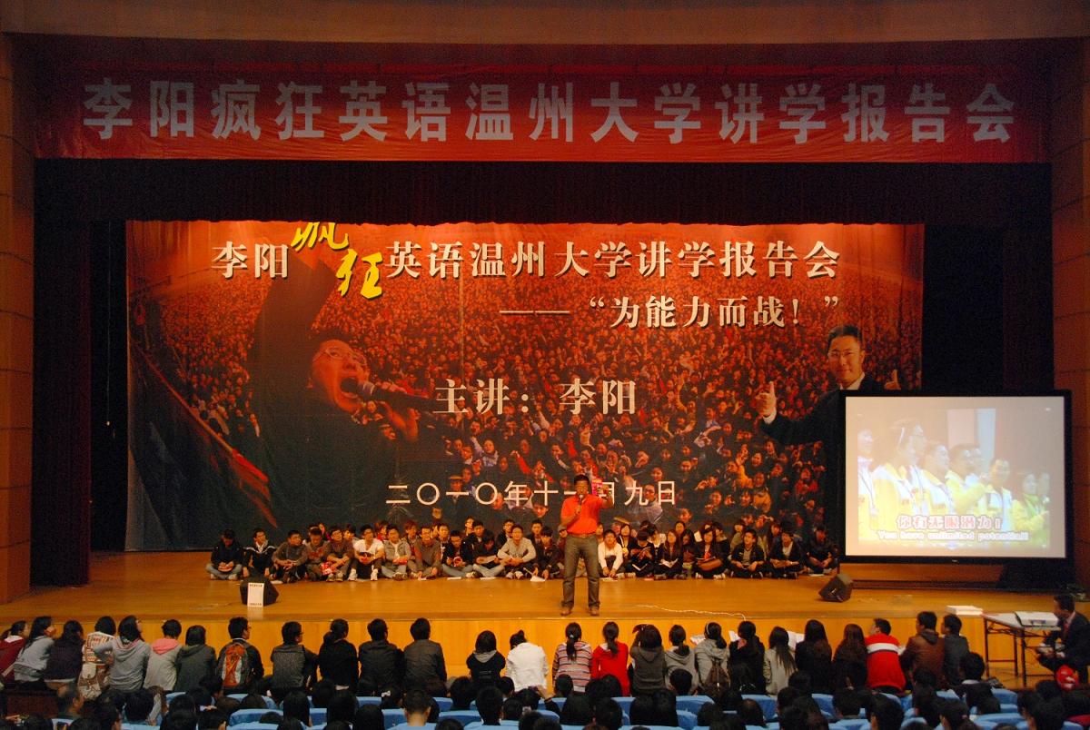 演讲中,李阳老师深情并茂且幽默的言语引得会场内爆发出一阵阵雷鸣般的掌声,现场气氛在李阳老师的带动下十分活跃。他带领着场内近1400多名温大师生一起感受疯狂英语的魅力。他幽默风趣又富有哲理的演讲感染了每一个人,大家跟着李阳一起”疯狂”的朗诵英语,从单词到句子到段落,现场气氛高涨,老员工活动中心演艺厅俨然成为了一个千人大声朗诵课堂,所有人都毫不吝惜自己的声音,此刻,只是尽情释放激情与豪迈,场内气氛一次次地达到高潮。一个半小时很快就过去,大家意犹未尽,虽然演讲时间很短暂,但是李阳老师在这短短的一个半小时里传授的是学习英语成功的秘诀,那就是最简单不过的“坚持”二字!相信在场的每一个人都会牢牢地记住这句话:The secret of success is persistence! 想象妈妈坚持20年做的几万顿饭,花了几万小时,带着爱心和耐心,我们就应该坚持下来。