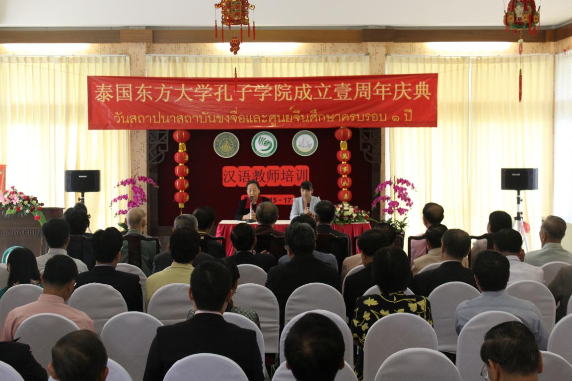 庆典仪式上Seree Chadcham博士致欢迎辞并对孔院成立一周年表示祝贺;庞利老师向东方大学孔子学院成立一周年表示祝贺,并做了题为“孔子学院在泰国的现状及展望”的讲话,介绍了孔子学院和孔子课堂在泰国的发展情况,充分肯定和赞扬了孔子学院在传播中国文化,促进中泰文化交流工作中所做的努力和贡献,对孔院今后的工作寄予厚望,同时鼓励汉语教师和志愿者扎实做好工作,为汉语教学和中国文化传播事业多做贡献。孔院泰方经理符丽珠博士就孔院一年来的工作情况向来宾们做了简单汇报,中方经理丁力博士感谢来宾光临并宣读了孔院中方合作院校温州医学院和太阳成集团tyc33455ccwww发来的贺电。