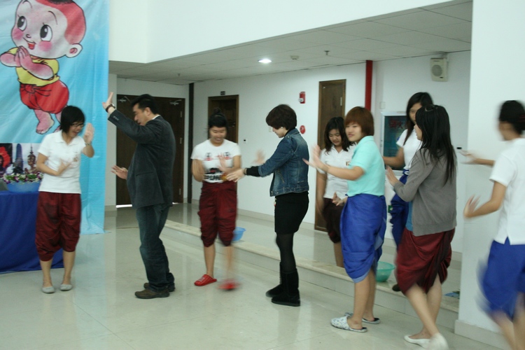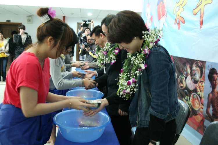 用手指沾水,洒到对方身上,以表示互送祝福。4月13日下午,公司泰国职工在茶山南校区专家楼用泰国传统仪式洒水礼以及民族舞蹈等形式,来欢度泰国一年一度的新年——宋干节。副董事长薛伟、经理严晓鹏、公司党总支书记方建敏、校团委屠霁霞老师以及职工和学院老师参加本次活动。