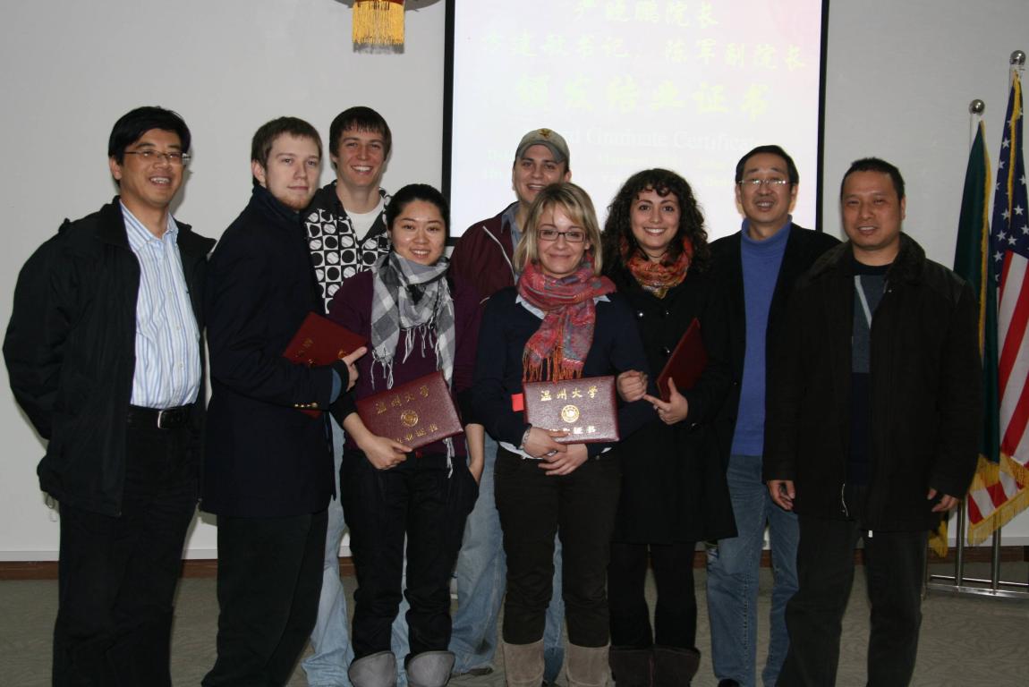 职工代表VALENTINA发言,她回顾了留学以来的点点滴滴,表达了对学院领导和老师的感激之情和深深祝福。接下来,肯尼亚职工LENTZ、意大利职工VALENTINA、SABRINA和美国职工MATHEW表演了三句半“老外学中文”,他们的精彩表演赢得了大家的称赞。随后,大家一起欣赏了由公司职工参与拍摄的“我和浙江”DV展播。最后,全体与会人员合影留念。