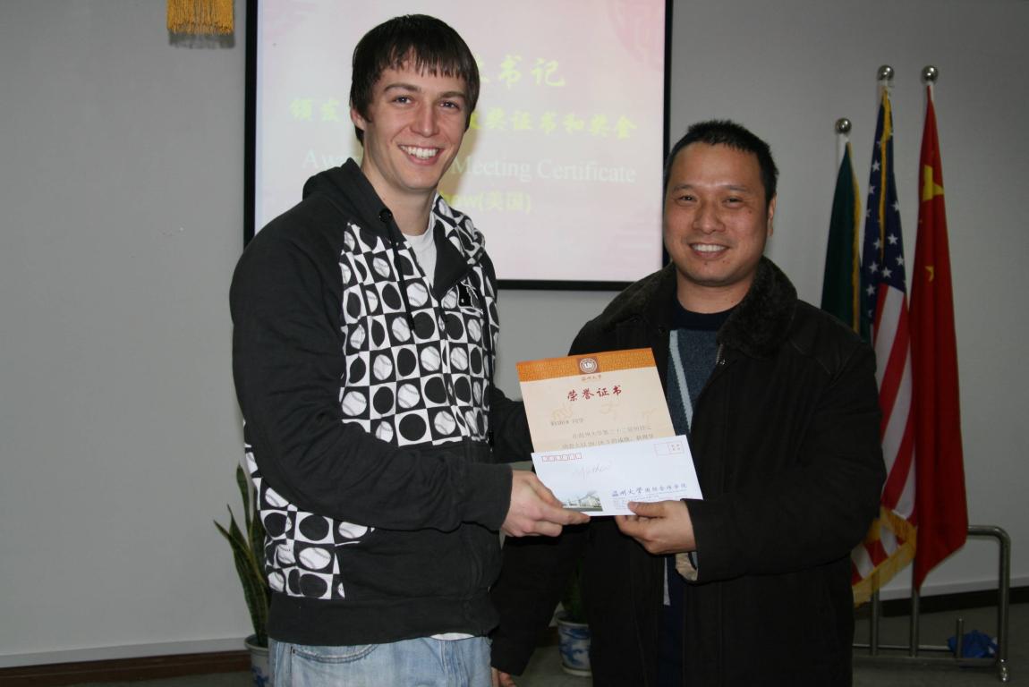 严晓鹏经理和方建敏书记分别为美国职工MATHEW颁发了“梦行浙江”摄影比赛和校运动会奖品。接下来包含丽老师和王洁曼老师代表学院赠送了礼物。
