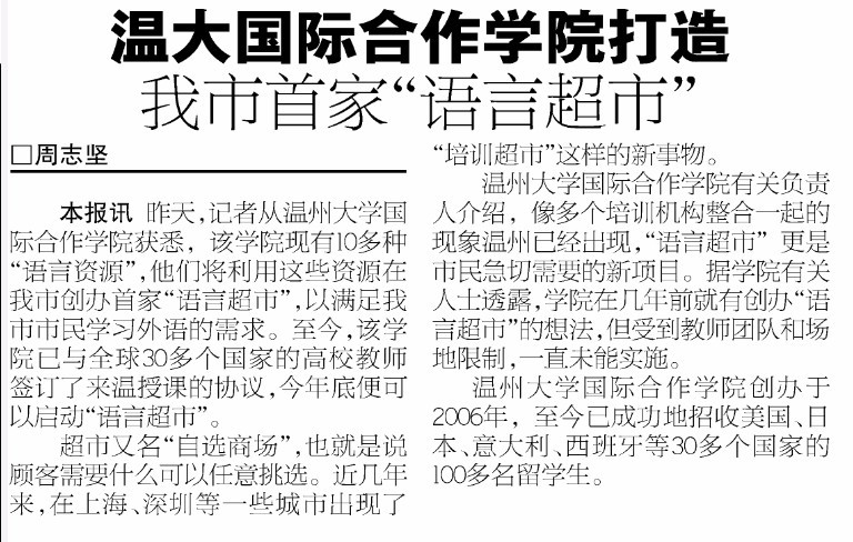 培训超市的诞生将宣告温州培训市场有了一种崭新的服务方式。培训超市里开设外语类培训,满足少儿、成年人等各个年龄阶段的不同培训项目的需求。培训超市将以市场化运作模式,以质量求生存,提供良好的学习环境,保证培训专业化,个人口碑化,社会认可化。同时培训超市将强化“超市”概念,并且围绕着“一站式选购”,“高性价比选购”的培训消费,将其打造成温州市外语培训行业的旗舰机构。同时在学院路校区,成教学院有着丰富的成人教育培训项目,家长自己参加成人教育培训,孩子参加外语培训,可以实现家长和孩子一起上课,一起下课回家的梦想。