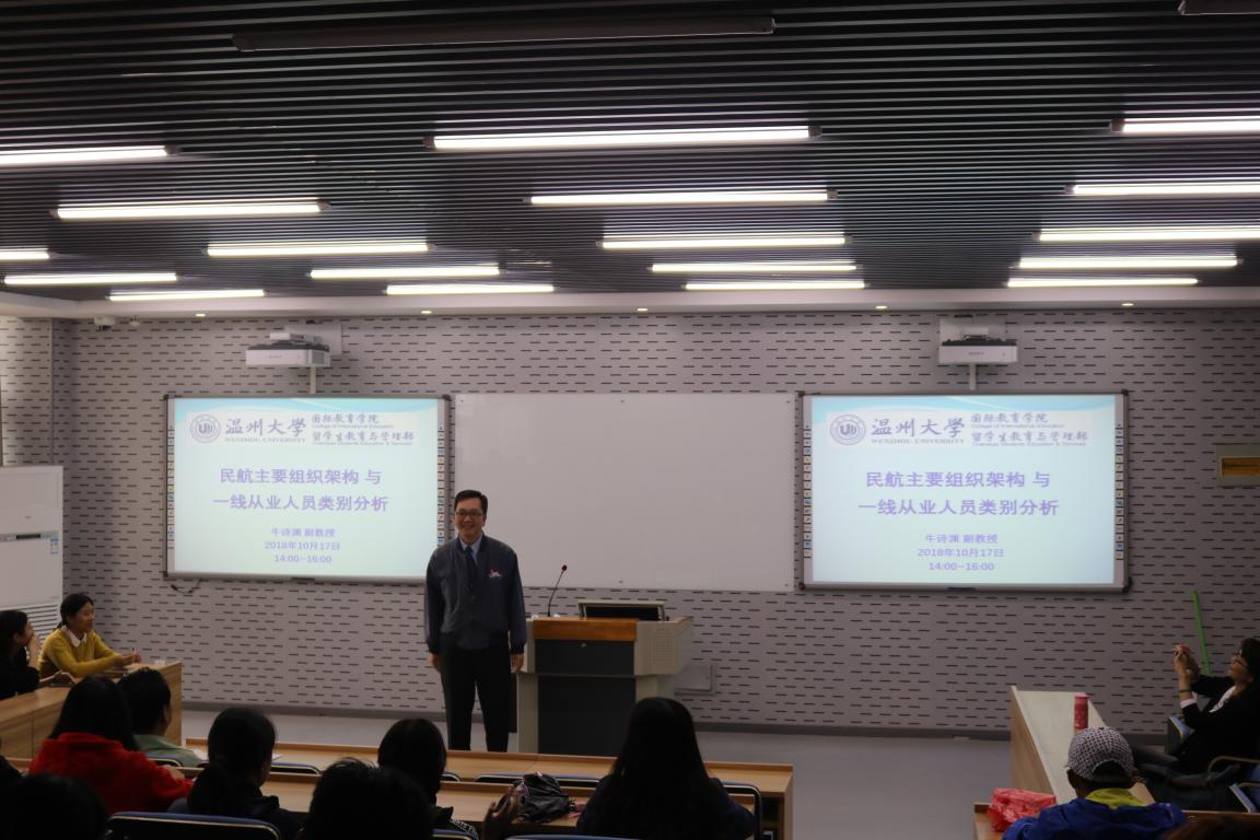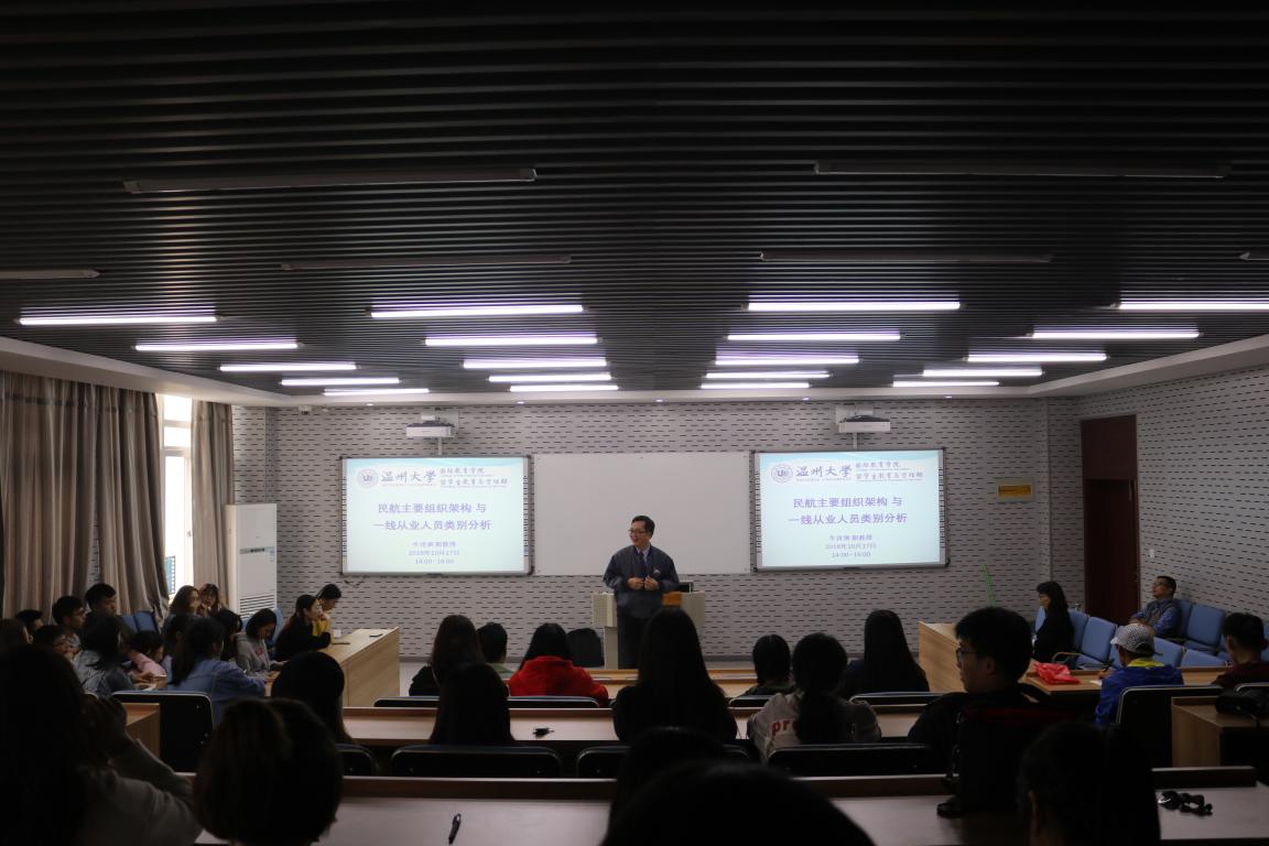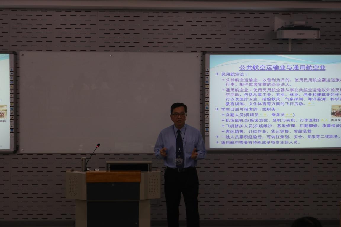 牛副教授之前在台湾的航空公司服务30年,亦曾稽查全球约50个国际机场的空侧及陆侧运作,了解航务、机务、空乘、航站、机坪、策画、行政、安全等民航营运与管理。于本次讲座中,先后介绍了民航运输经济体系与主要组织架构、民航主要一线从业人员类别、民航业对应征者的资格要求等。
