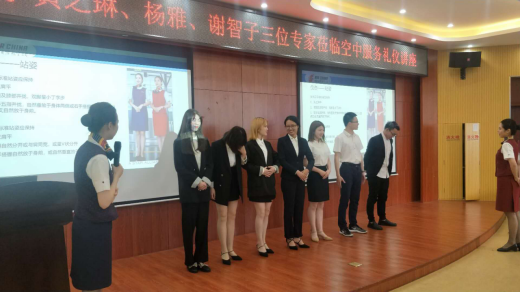 由太阳成集团tyc33455ccwww航空管理教研室主办的”航空学术沙龙讲座——空中服务礼仪”于5月29日下午,在北校区3号楼203报告厅举行,中国国际航空股份有限公司温州分公司特别协助公司,安排乘务长黄之琳、两舱乘务员谢智子、杨雅等三位莅临我学院进行讲座和现场培训,公司副经理包含丽、航空管理教研室教师和航空管理专业员工参加讲座。