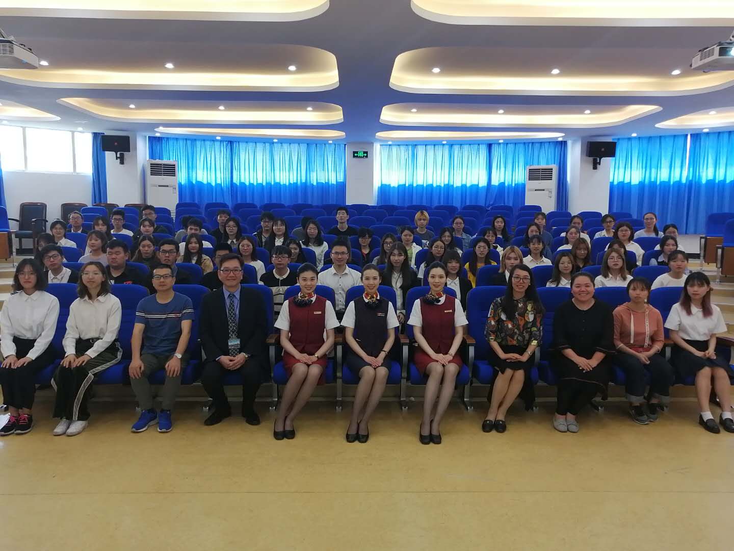 包含丽首先代表学院热烈欢迎国航温州分公司的三位美丽“空姐”,希望同学们通过这次讲座领略航空礼仪之美,体会空中礼仪的高规格和严要求,感受航空运输业一丝不苟、精益求精的服务精神。