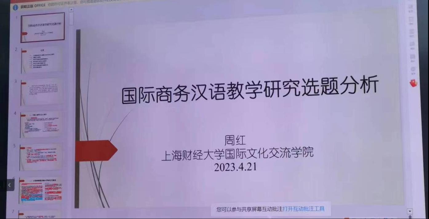 周红教授基于汉硕生商务汉语教学研究论文选题,从研究领域、研究方法、写作范式、问题意识、研究框架等方面对论文选题进行统计与分析,并结合个案讨论研究的可行性,最后根据国际中文教育发展需求提出了一些可能的研究方向,拓宽了公司师生国际中文教育研究的思路,为国际中文教育发展提供了理论支撑。