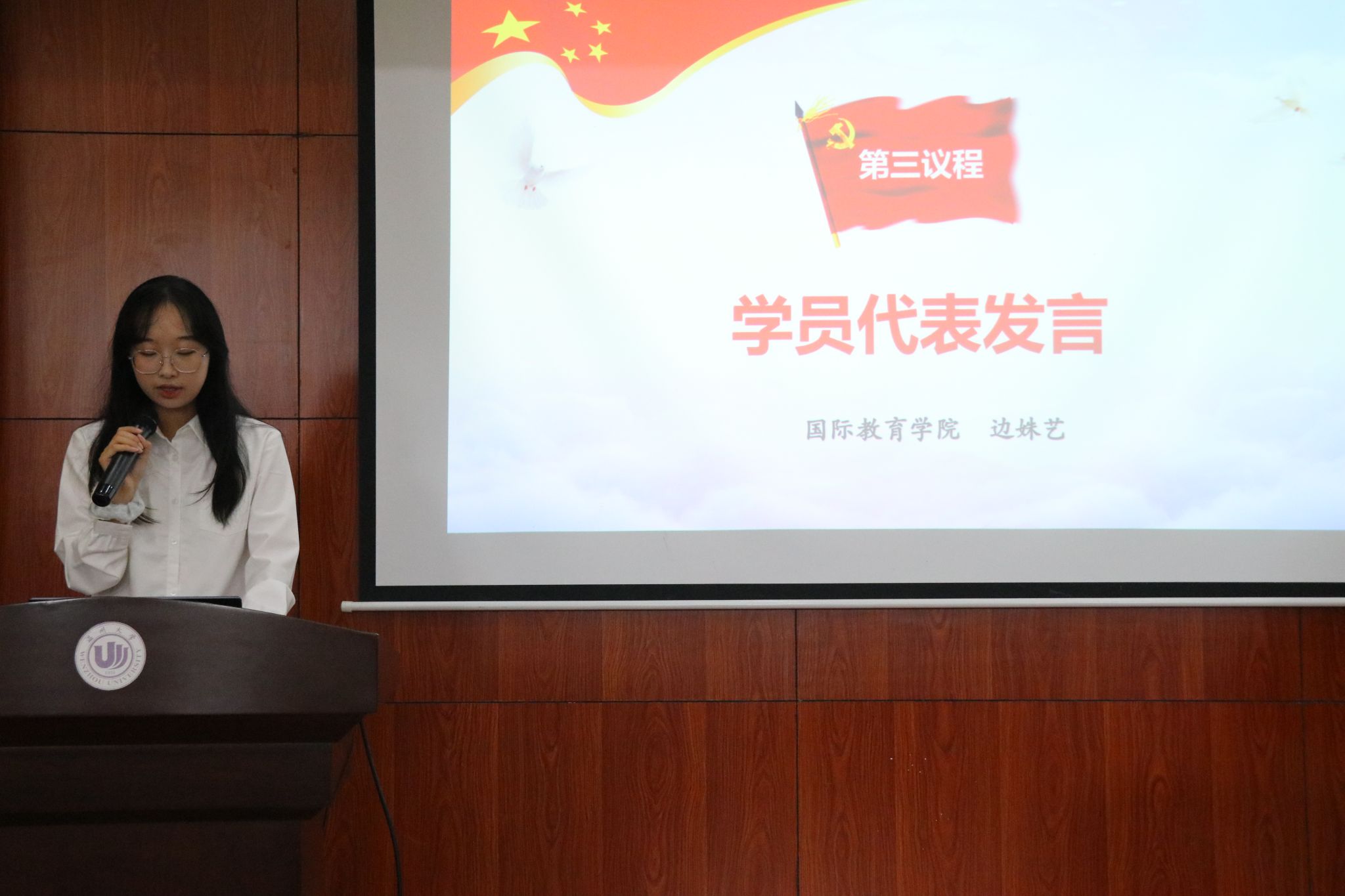 第三项议程,员工代表边姝艺发言。她呼吁全体学员要应当扛起新时代赋予的神圣使命,坚定理想信念,练就过硬本领,端正学习态度,深入思考并学深悟透此次培训班内容,将所学转化为实践,在大有可为的新时代里大有作为。