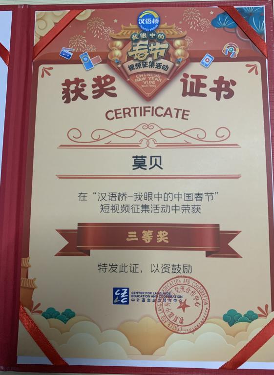 在刚刚结束的“汉语桥-我眼中的中国春节”短视频征集活动中,来自莱索托的2018级化学工程与工艺专业职工莫贝(THIPANA MOPE)荣获三等奖。