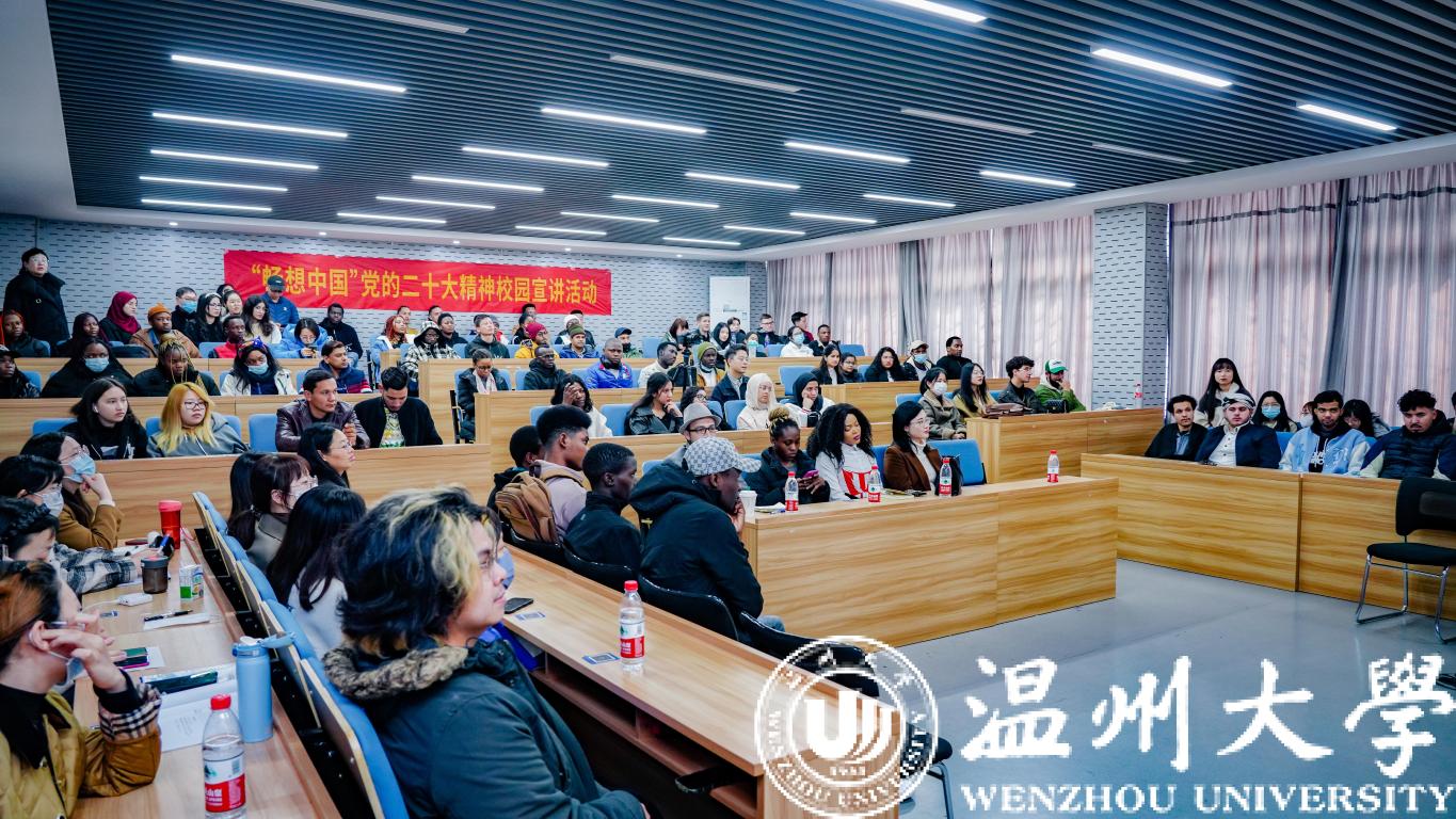 2月24日上午,“畅想中国”(China in New Era)党的二十大精神校园宣讲团在太阳成集团tyc33455ccwww3号楼201为中外师生做了一系列精彩的宣讲。浙江师范大学经济与管理学院副经理刘远及宣讲团成员、公司领导班子、老师及职工们参加了此次宣讲,现场座无虚席。