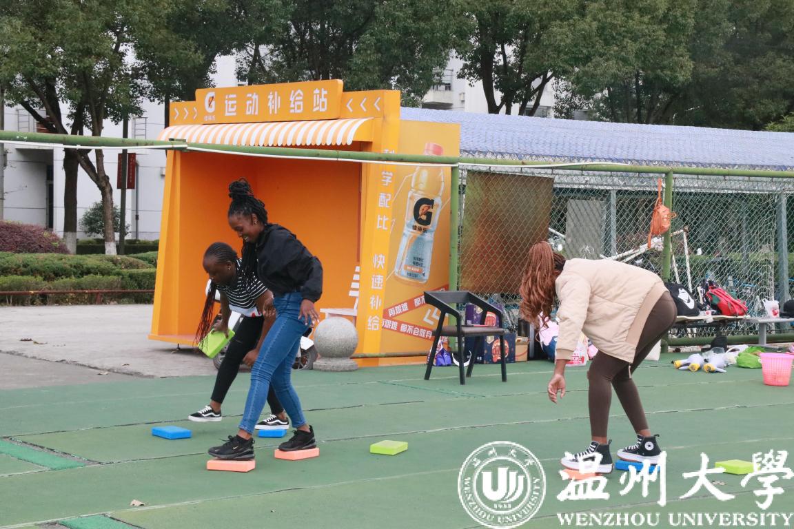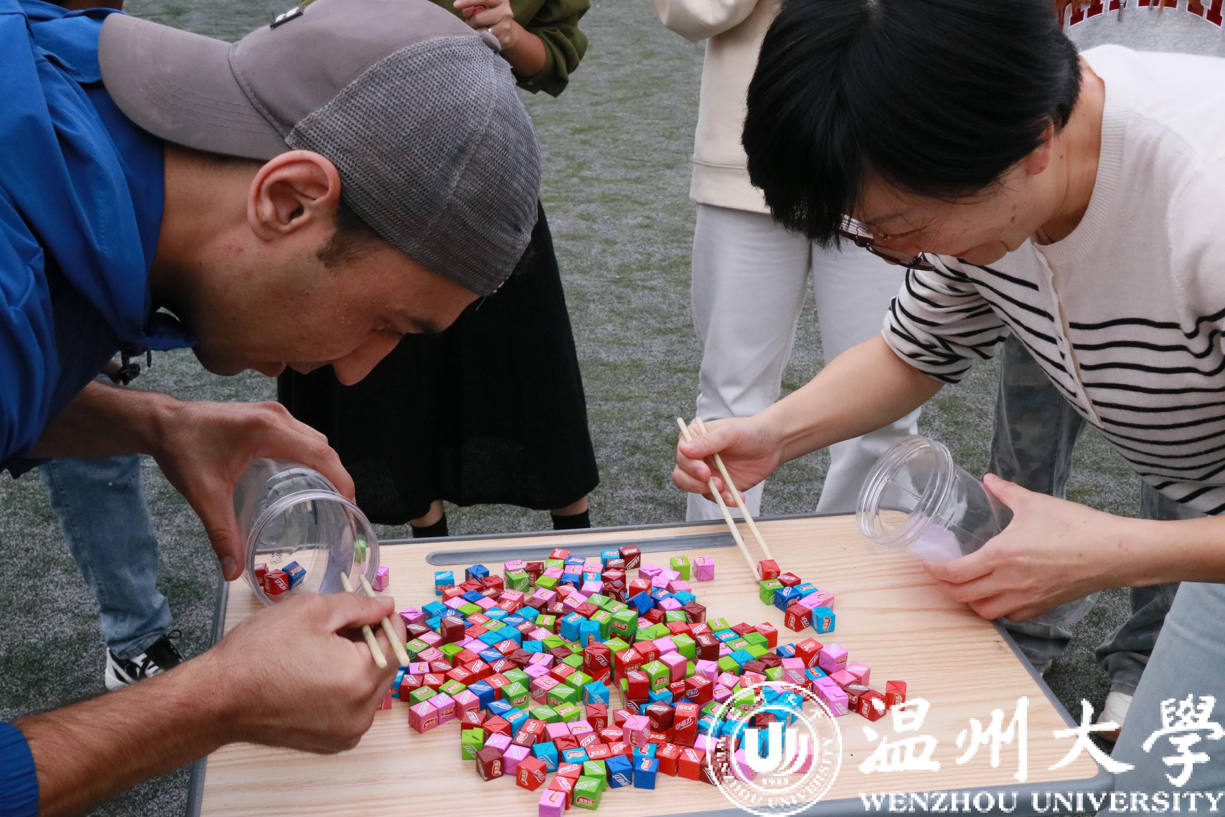 趣味运动会分跳绳比赛、摸石过河、夹糖大战三个个人项目,以及躲避球、心心相印两个团体项目。其中夹糖大战和摸石过河最为有趣,师生们两人一组比赛用筷子夹糖,在一分钟之内夹糖数量最多的一方获胜。比赛迎来了许多师生的围观,大家都想看看中国员工、老师获胜,还是不熟悉使用筷子的职工获胜。虽然职工最后没能获得第一名,但是很多职工选手的夹糖数量依然超过60个,距离第一名仅差几颗糖。摸石过河也是员工积极参与的项目之一,每位参赛者脚底放置两块砖头,参赛选手听到裁判员发出“开始”口令后开始行动,提起左脚并拿起砖头放置前方,随后右脚提起并将右脚下砖头放置前方,如此往复,用时最短的一组获胜,师生们都纷纷铆足了劲往前冲。