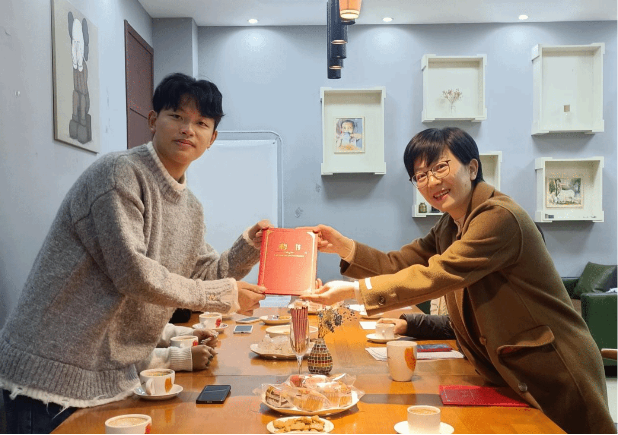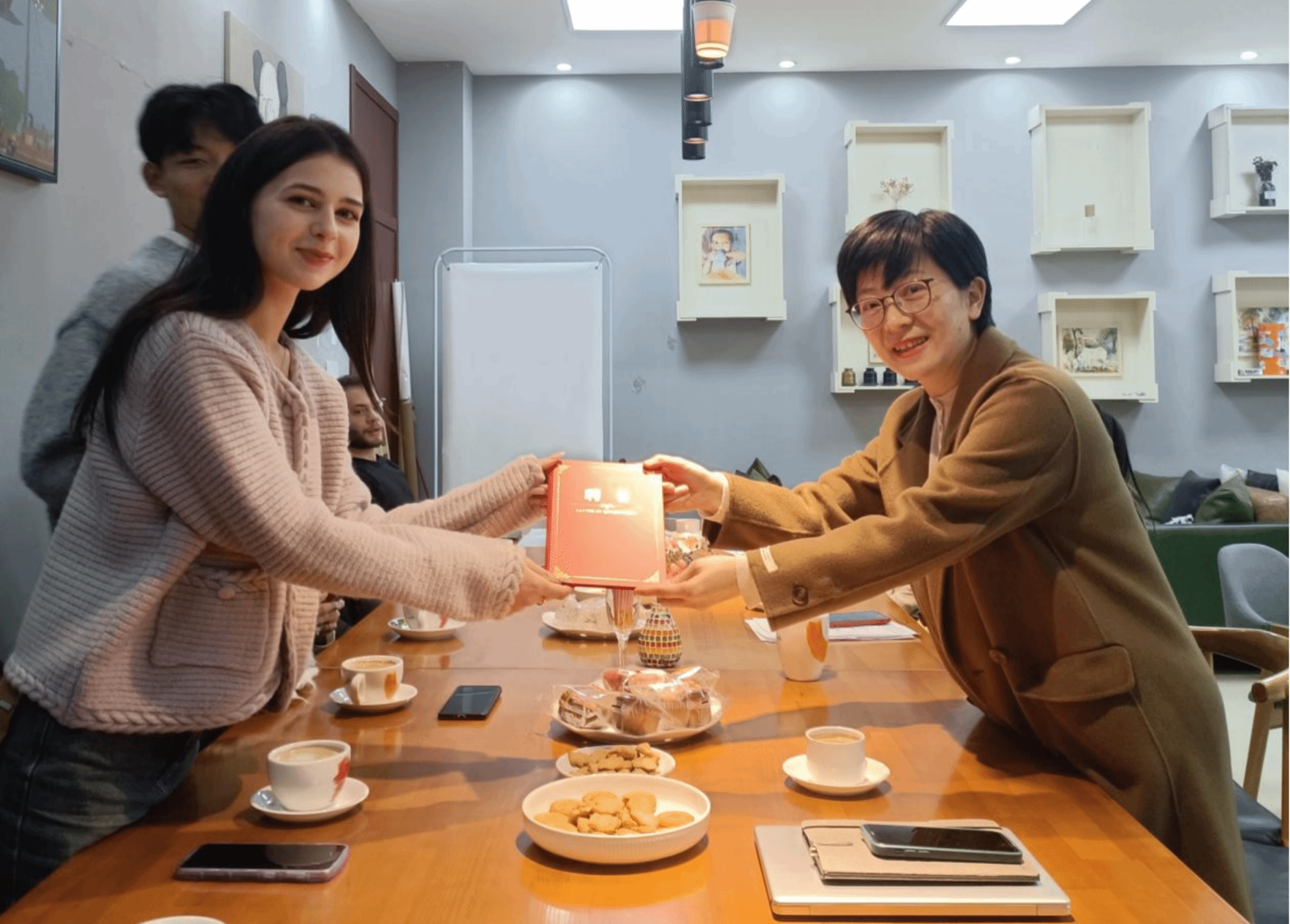 活动伊始,林爱菊书记及熊勇副经理首先对顺利完成学业的交换生们表示最热烈的祝贺,并充分肯定了交换生们在异国他乡的学习中所展现出的勇气、智慧和适应能力,以及为两所大学的交流与合作所做出的积极贡献!随后,林爱菊书记及熊勇副经理为参与本次合作项目的交换生们颁发了结业证书、员工联络员聘书以及学院为他们精心准备的结业礼物,希望同学们能够继续保持开放的心态,积极参与国际合作,为推动世界的发展做出贡献!