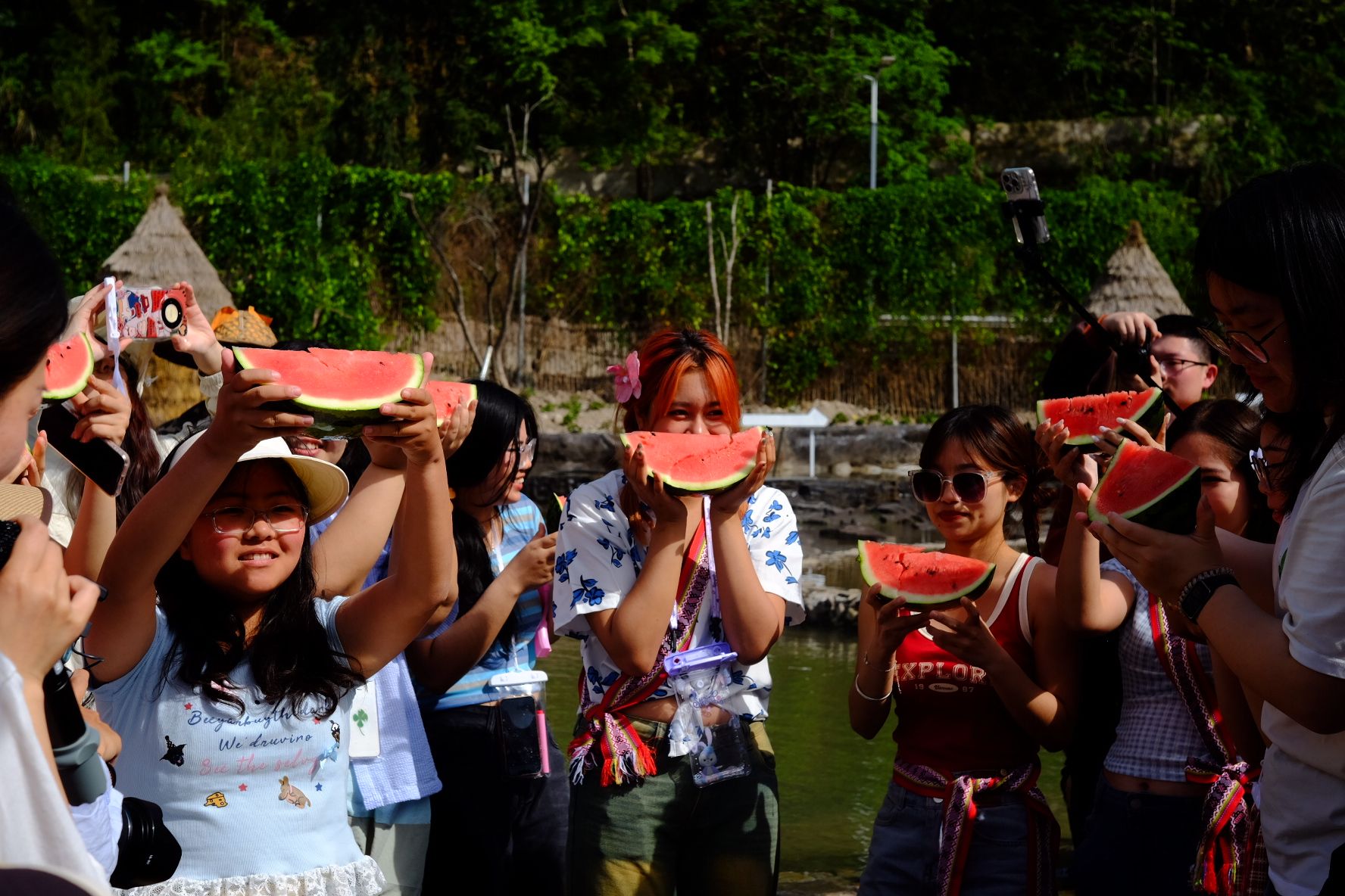 活动现场,一系列趣味项目轮番登场:水上拔河、排球竞技、摸溪螺比赛、小黄鸭竞速赛、吃西瓜比拼……泰国学子踊跃参与,乐享其中。“第一次来到南浦溪,这里的山水如画,亲水活动趣味十足,让我在温州度过了一个难忘的宋干节!”身着泰式传统服饰的职工风清兴奋地说道。自由活动环节,职工们手持水枪、水盆,与在场师生互泼象征祝福的清水。欢腾的水花中,中泰文化悄然交融,现场观众纷纷加入,共绘一幅跨文化和谐图景。