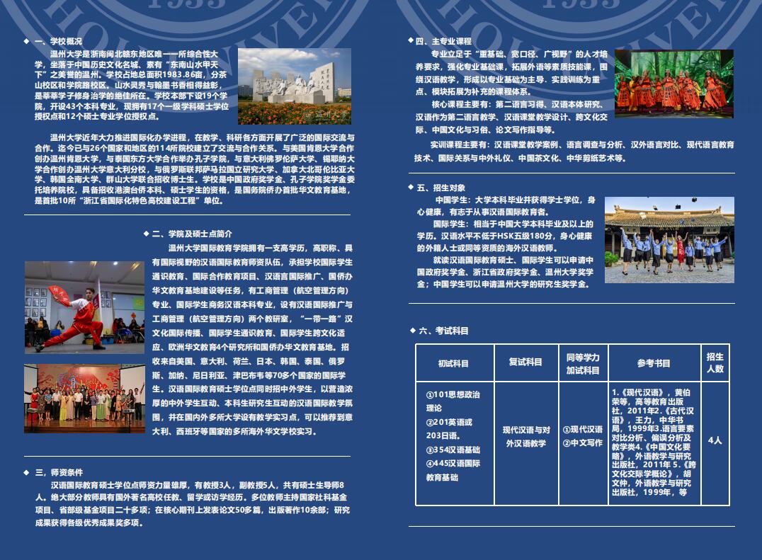 ①101思想政治理论②201英语或203日语。 ③354汉语基础 ④445汉语国际教育基础 | 现代汉语与对外汉语教学 | ①现代汉语; ②中文写作 | 1.《现代汉语》,黄伯荣等,高等教育出版社,2011年2.《古代汉语》,王力,中华书局,1999年3.语言要素对比分析、偏误分析及教学类4.《中国文化要略》,外语教学与研究出版社,2011年 5.《跨文化交际学概论》,胡文仲,外语教学与研究出版社,1999年,等 | 4人 |